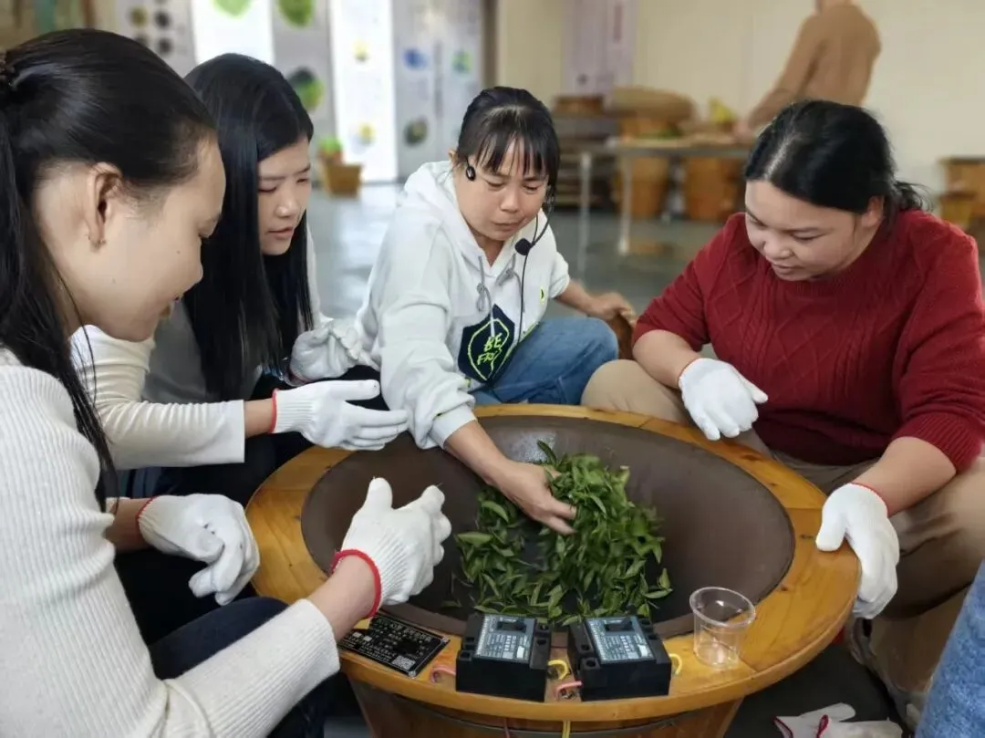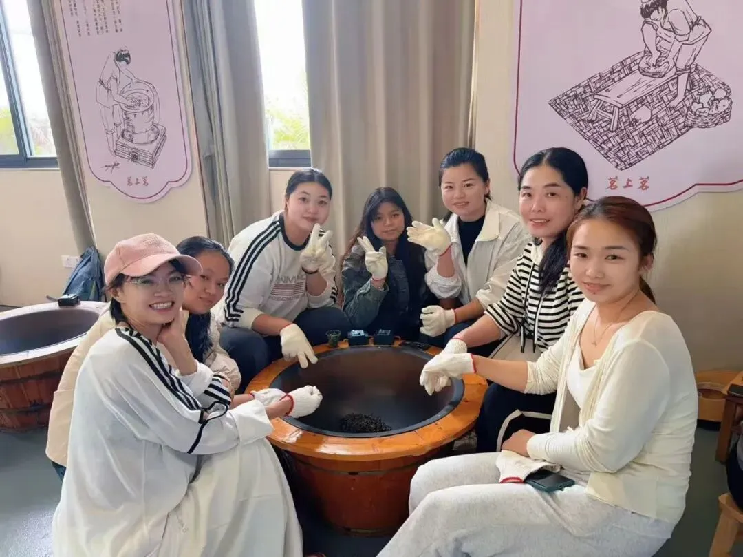 随后的炒茶体验环节,大家围在灶台旁,跟着老师傅感受传统炒茶工艺,看着茶叶在手中慢慢卷曲、释放出醇厚香气,沉浸式体会茶文化的魅力。