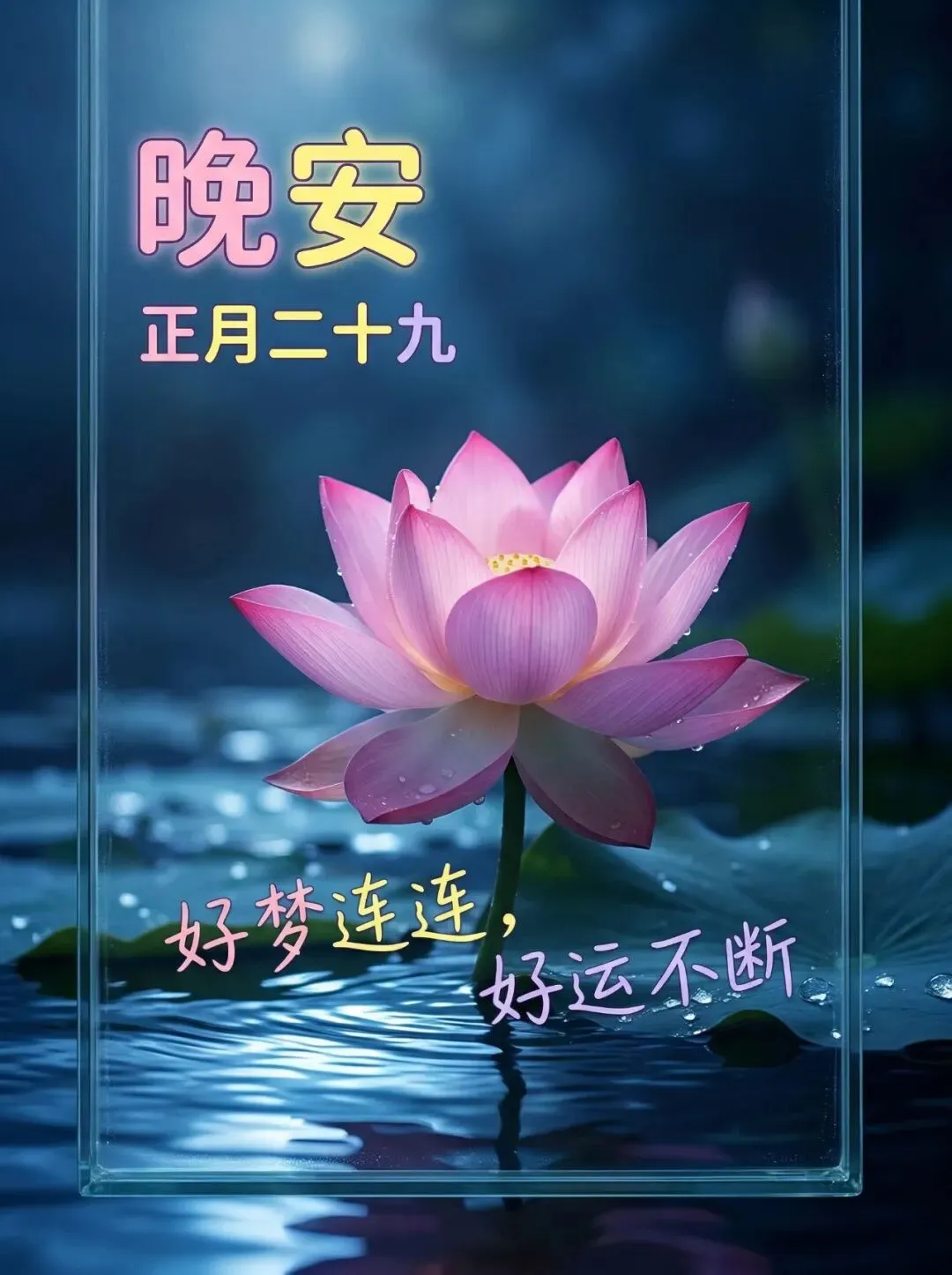 正月二十九晚安!愿你的梦里——有花有草有阳光,有山有水有好运,有亲人在身边笑!这一夜,好梦连连,醒来又是崭新的一天!🌙✨🍀