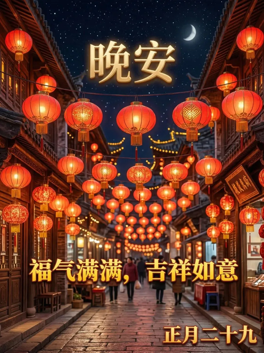 正月二十九,福气不歇!白天接了一天的好运,晚上再接一波福气——睡着了也有福,梦着了也有运!2026马年,福气满满到天亮!🌙🧧🍀