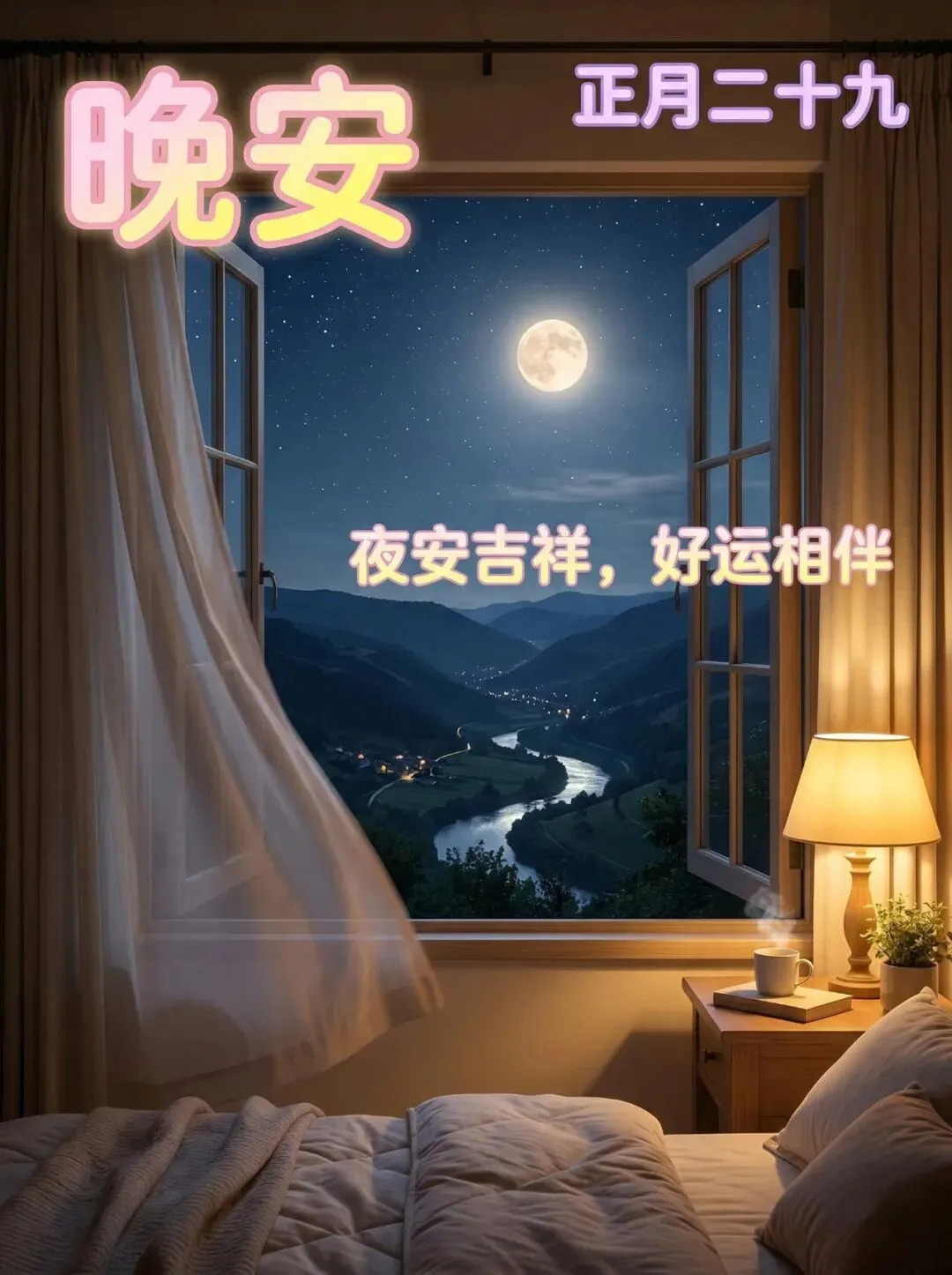 正月二十九,春风渐暖,夜色也柔了。愿这份晚安祝福像一杯热茶,暖到你心窝里!今晚好好睡,明天好好过!🌙💖😊