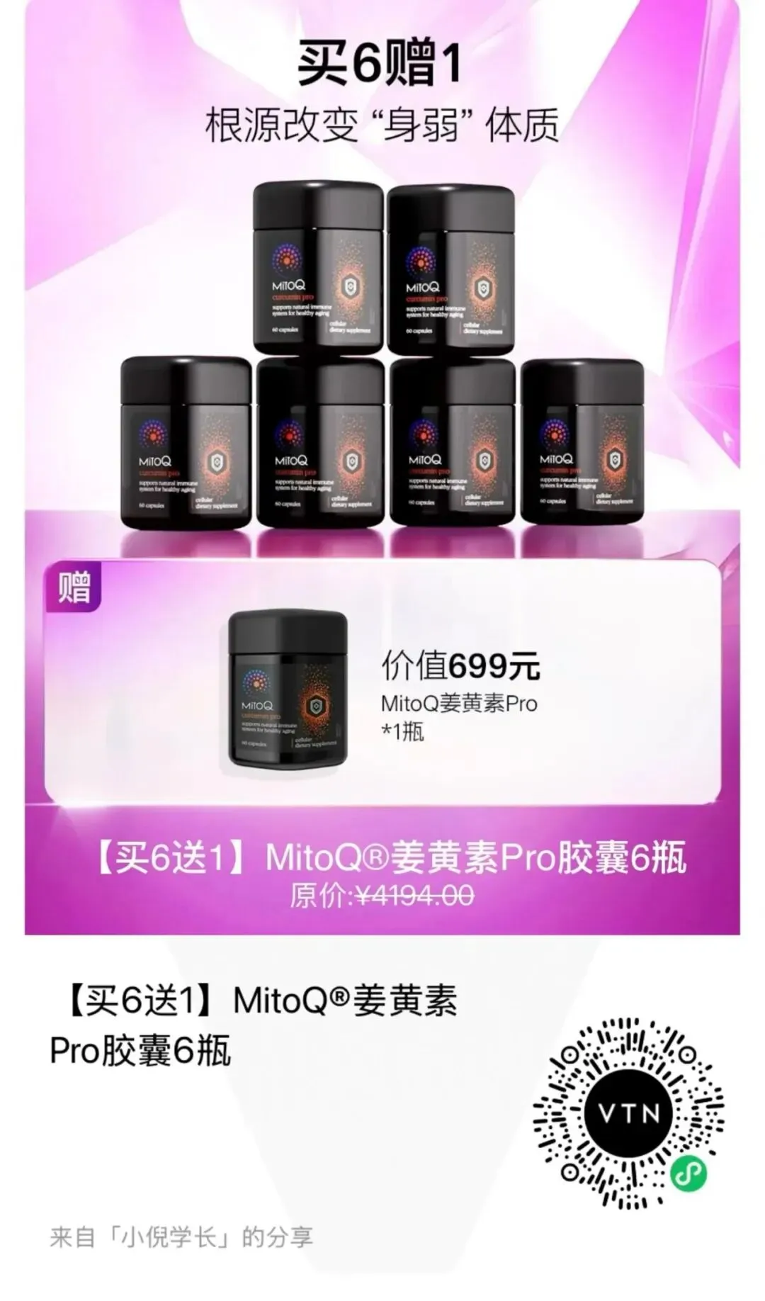 当前位置:首页>美女资讯>VTN3.8女神节-【买6送1】MitoQ 姜黄素Pro胶囊60粒*6瓶送1瓶