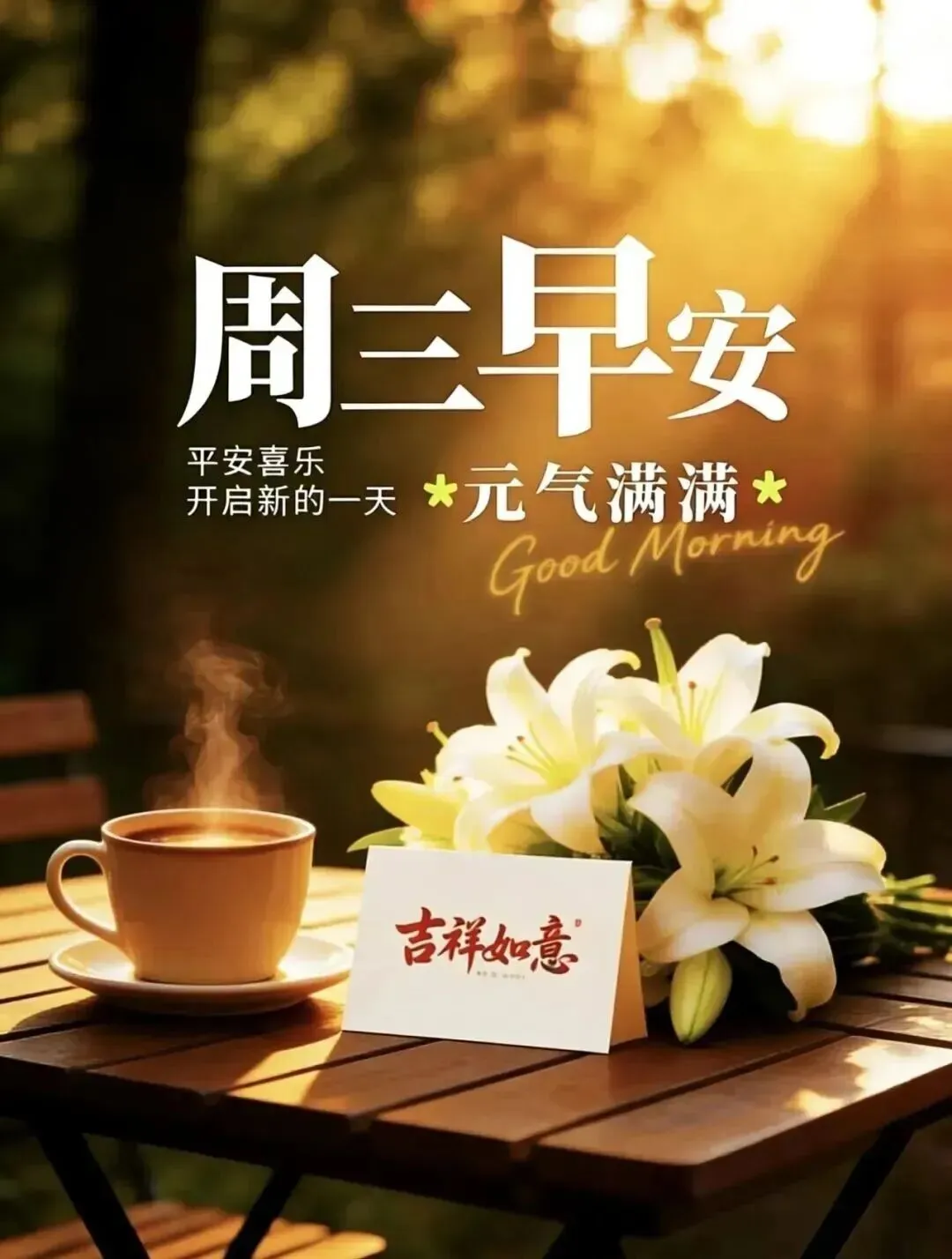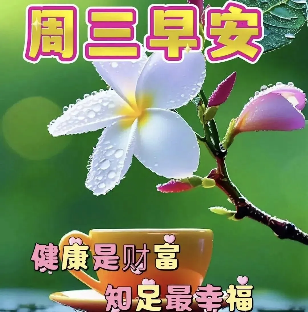 1. 周三早安呀☀️!新的一天,愿你带着周初的朝气,扫走所有疲惫~喝杯热茶暖暖心,脚步轻缓走在阳光里,烦恼悄悄溜走,生活满是温柔与欢喜,日子顺顺当当,平安又安康🍵✨!