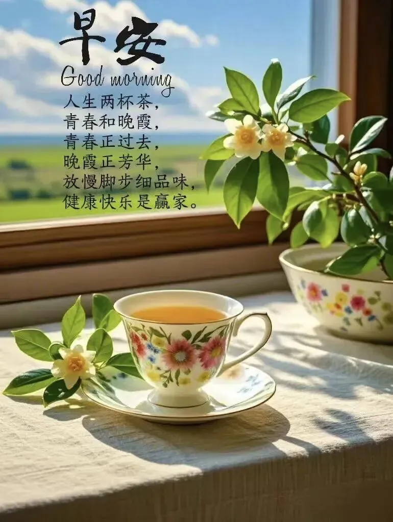 9. 早安周三🌞!新的一天,愿你把烦恼留在昨天,把欢喜带进今天~喝杯热茶暖身心,走在晨光里添活力,工作顺顺利利,生活甜甜蜜蜜,平安喜乐常伴,万事皆可期待🍵✨!