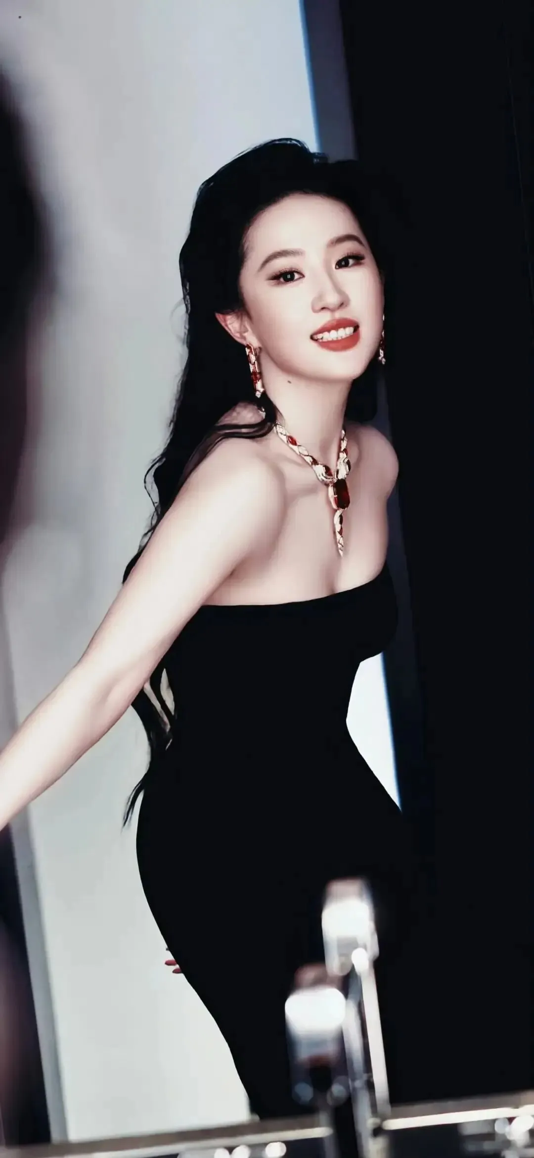 就像这张,刘亦菲穿着黑色抹胸衣裙,俏脸清丽脱俗,五官精致,唇红齿白,乌黑的秀发飘逸,露出白皙的香肩和傲人的事业线,大秀自己凹凸有致的魔鬼身材,绝对性感撩人!