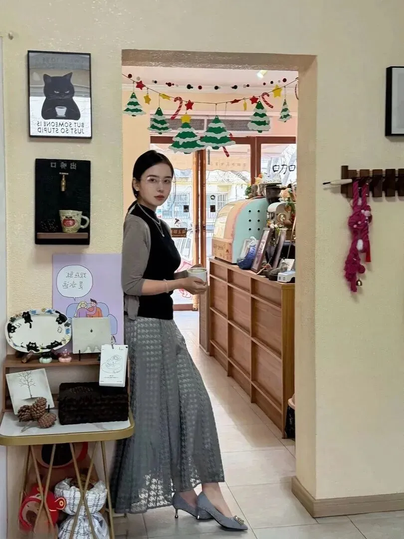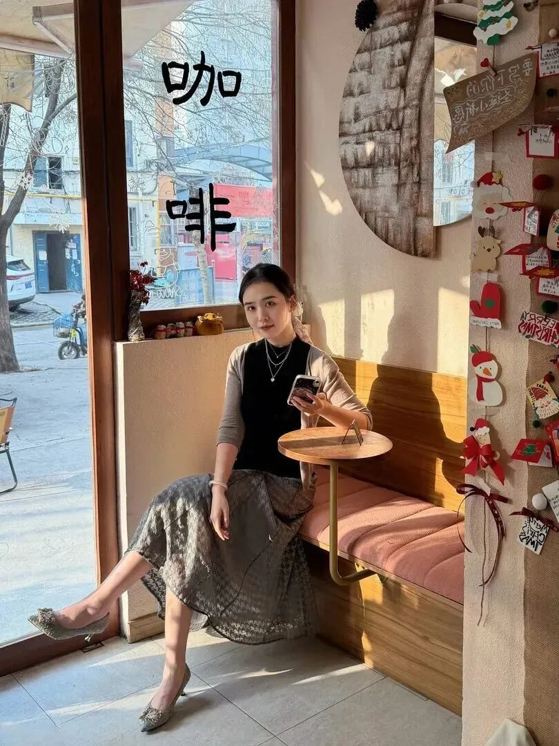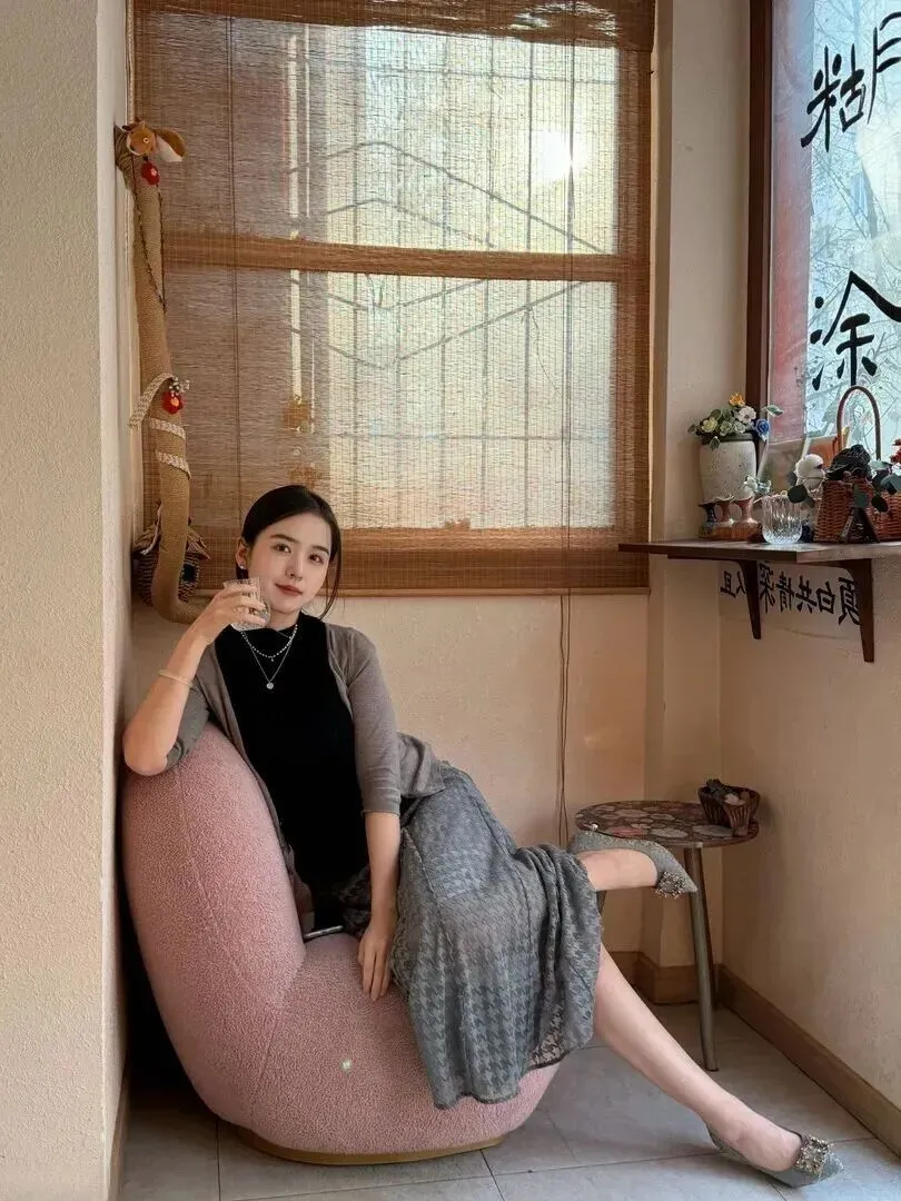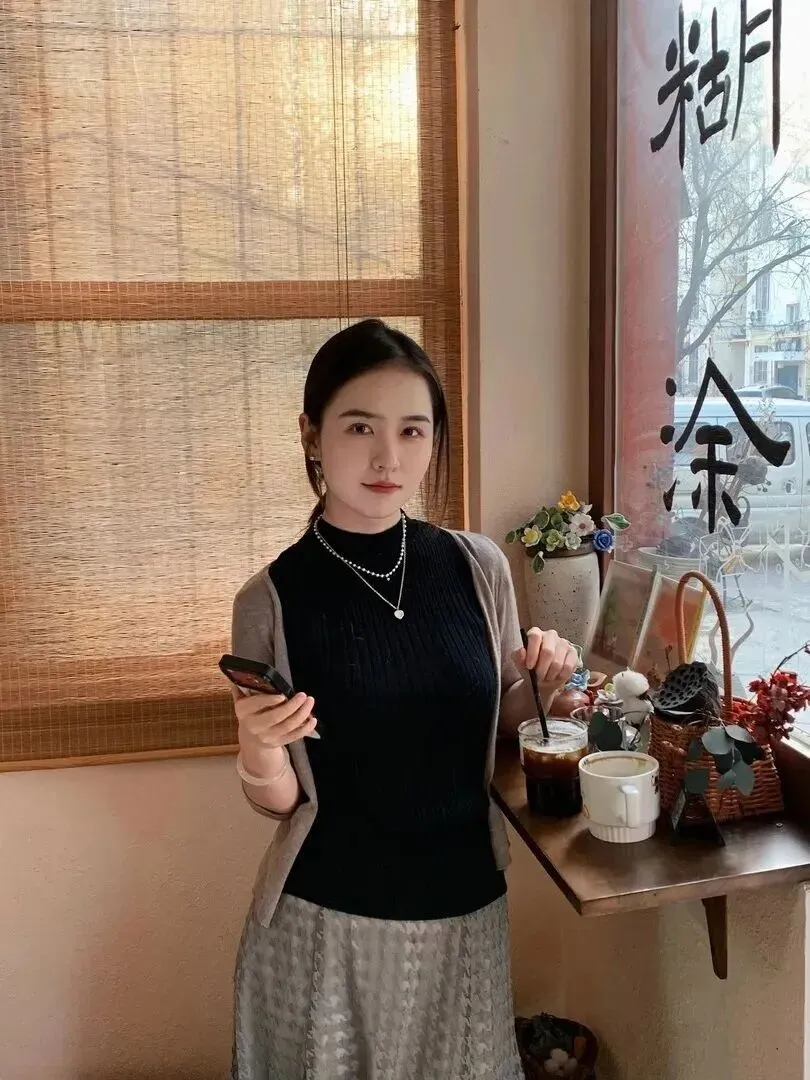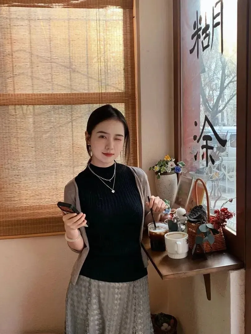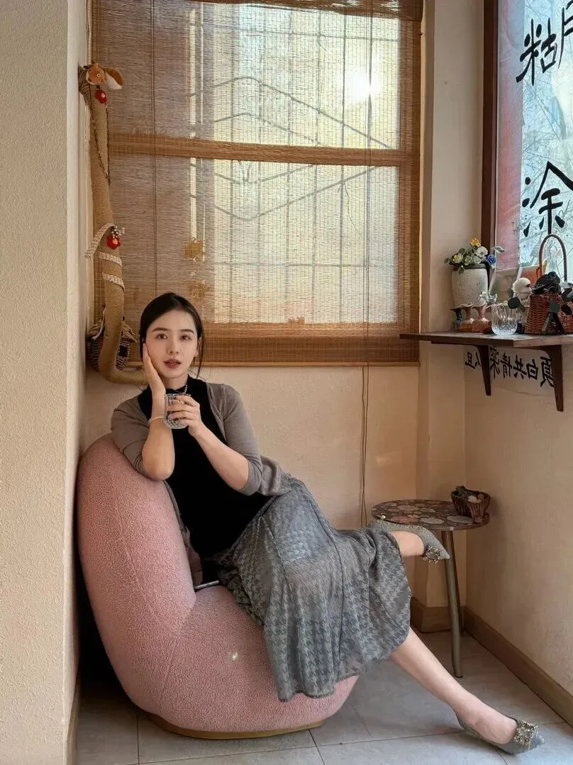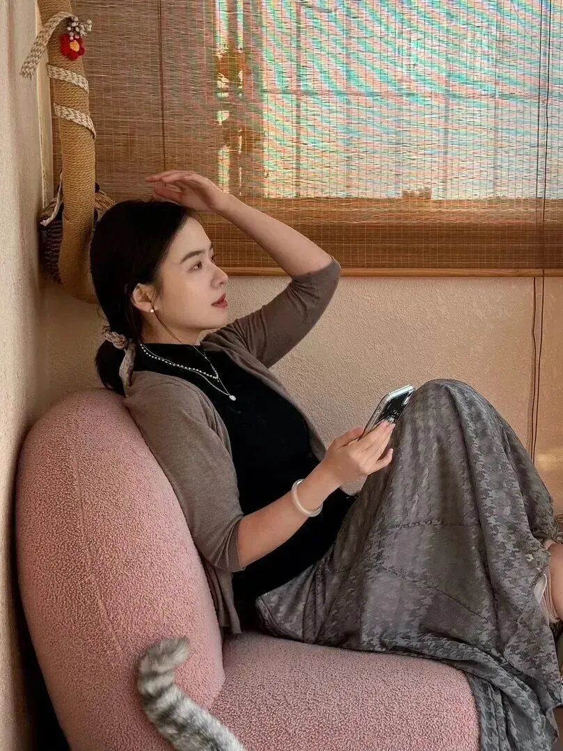 她的肩上挂着一件浅灰色的薄款开衫。开衫是七分袖的,只露出来手腕最细的部分。材质很薄但是又不能透光,深秋初冬穿着刚刚好。开衫没有扣起来,随意敞着,整个人透出一股松弛感。正如冬日的阳光,不刺眼但温暖地围绕着你。