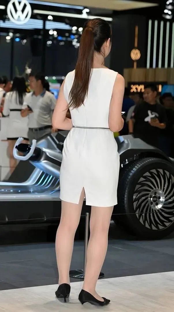 米白色无袖连衣裙加上银色腰带,侧身看曲线很好。黑色尖头细高跟鞋上面装饰着蝴蝶结,不甜也不腻。穿上薄袜子后,腿部皮肤就越发平滑细致了。高马尾显出人的精神,但整体温柔又带有小性感。