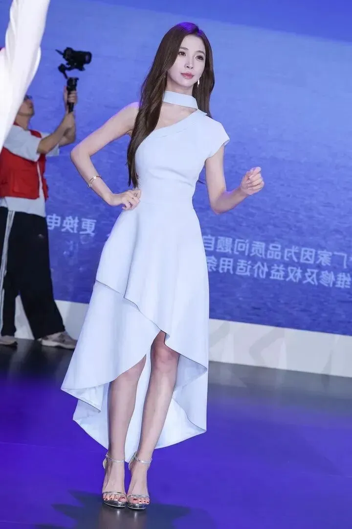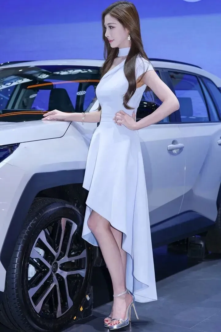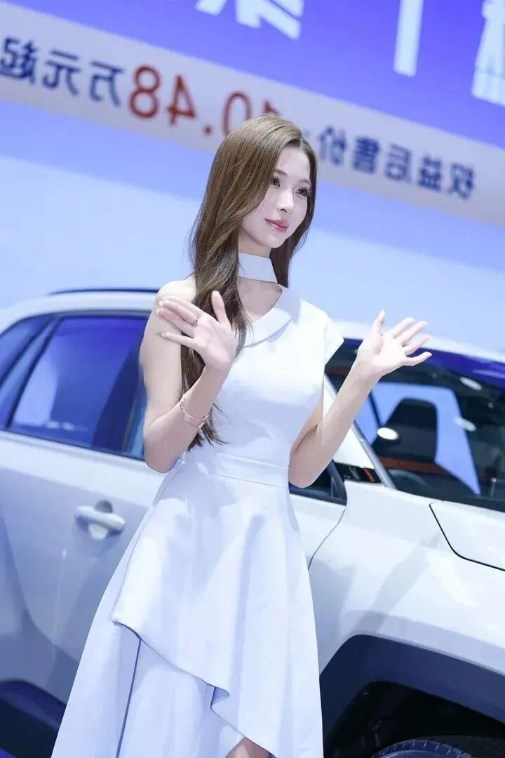 最后她靠在白色的车边上,露肩不对称的设计使她更加的动人。一字带细高跟凉鞋能将腿型显现出来而且是直直的、长长的,既简约又好。说真话,这套穿着放在时尚杂志上肯定可以当封面,但是放到车展现场,她表演出来的才是更具有真实感的。