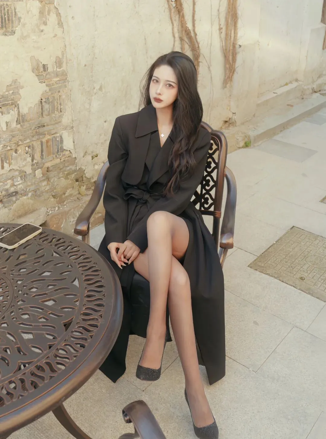 9 组黑灰撞色多场景写真姿势|从石阶到壁炉,拿捏酷飒氛围感