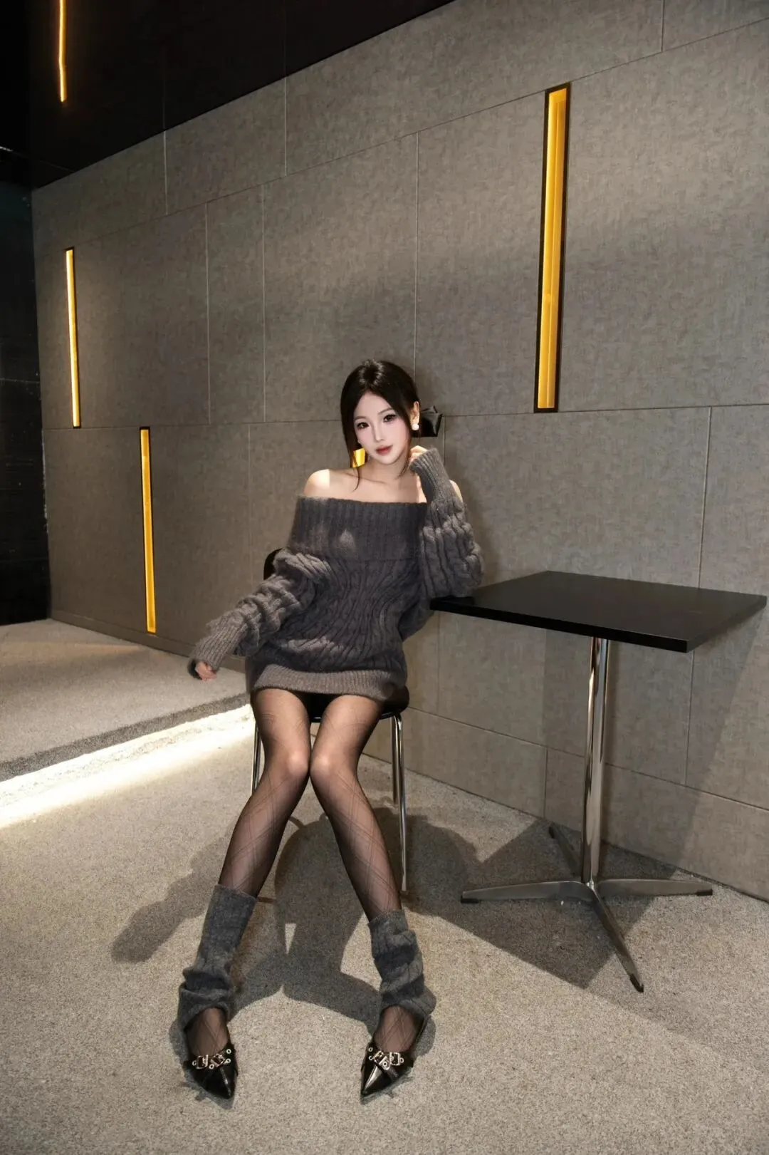 侧身坐在壁炉旁,单腿自然侧抬,一手轻搭身侧,身体微微侧转,背景是楼梯与壁炉,显利落又有细节,轻松拿捏酷飒感。