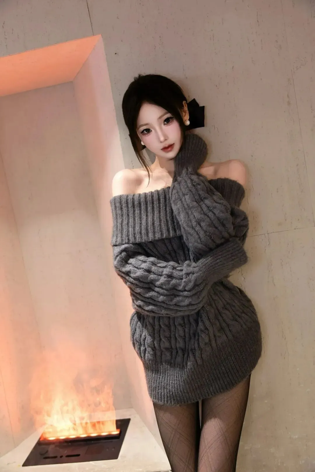 单手轻抱衣摆,侧身站在壁炉前,身体微微侧转,背景是壁炉与墙面,姿势冷艳又高级,轻松拿捏酷飒氛围感。