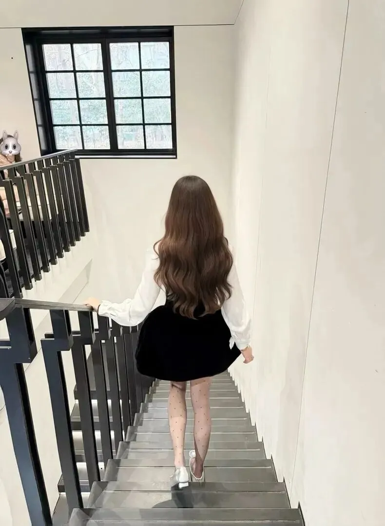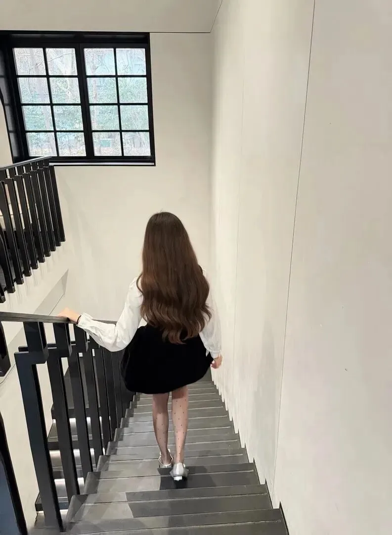 另一条楼梯背影是清冷的路线。米白色长袖衬衫质地柔软,黑色丝绒花苞裙质地好。一软一硬相对立又互相补充。在楼梯上背影干瘦,有一种疏离的意味。肉色丝袜带小黑点,平衡色彩,银色粗跟单鞋加一点甜酷。黑白灰配色更显眼的是它处在简约背景之下。