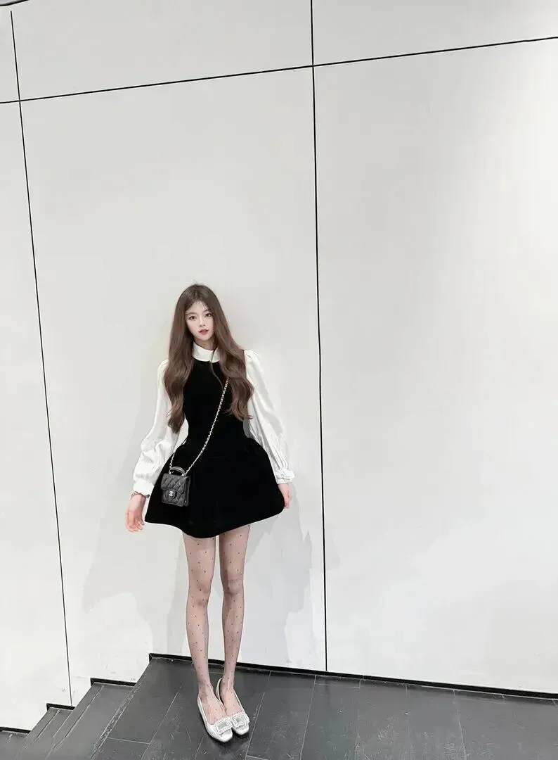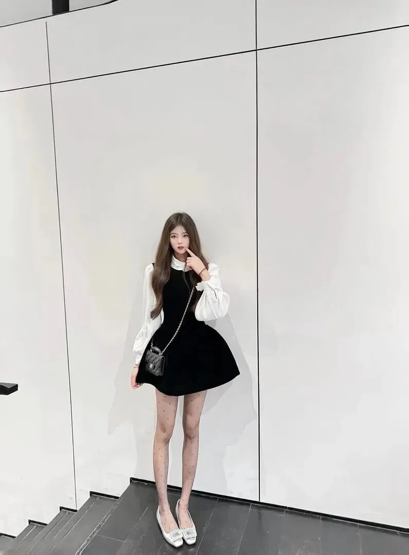 纯色背景下这件假两件连衣裙的优势就展现了出来。白色衬衫两侧有泡泡袖,黑色丝绒外搭反差大,柔中带俏。收腰处显腰细,短裙衬脚小。丝袜是透明底加小黑点,带有小性感的丝袜。银灰方头单鞋,亮面加闪钻有较好的精致感。黑色菱格纹链条包配裙子效果好。