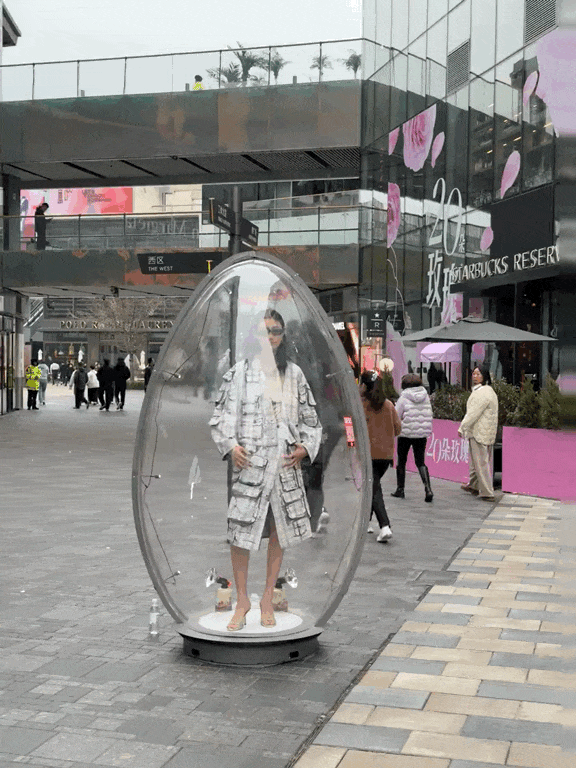 这是Diesel品牌「城市寻蛋」互动秀的中国落地版,把秀场搬进街头,以真人模特搭配透明蛋装置制造话题。