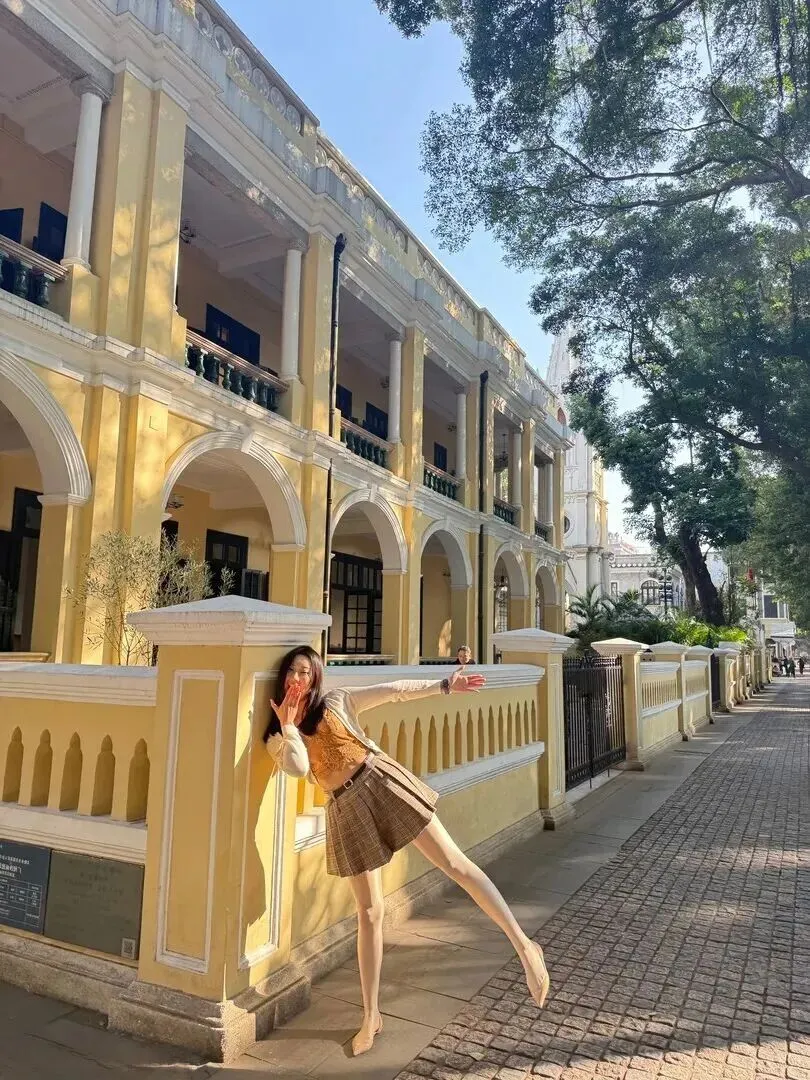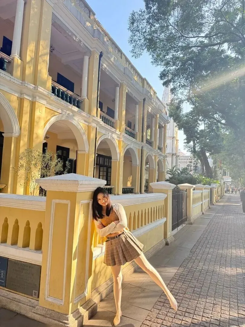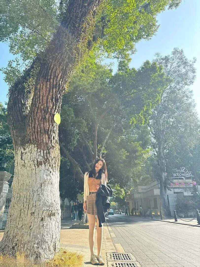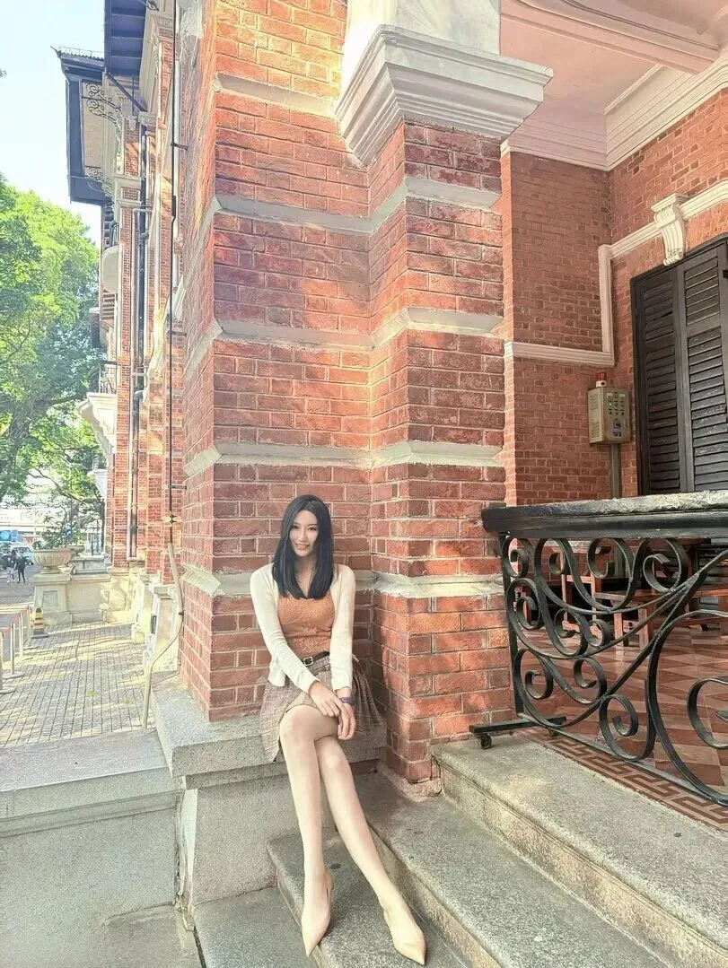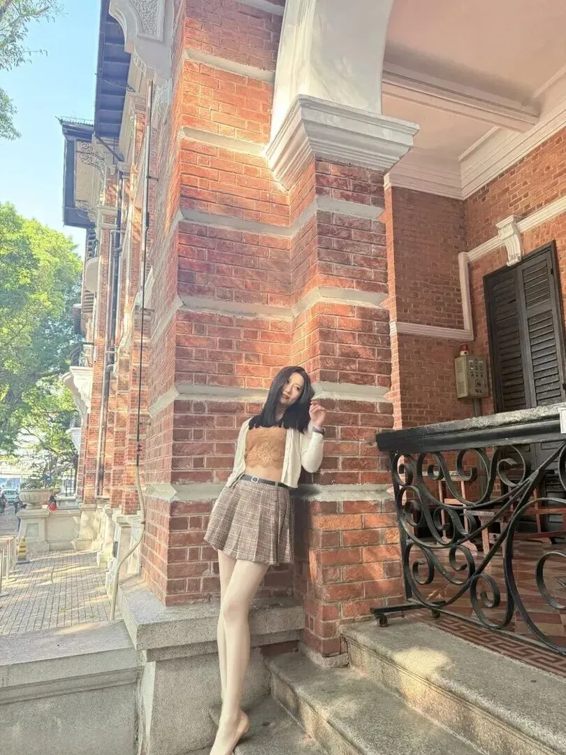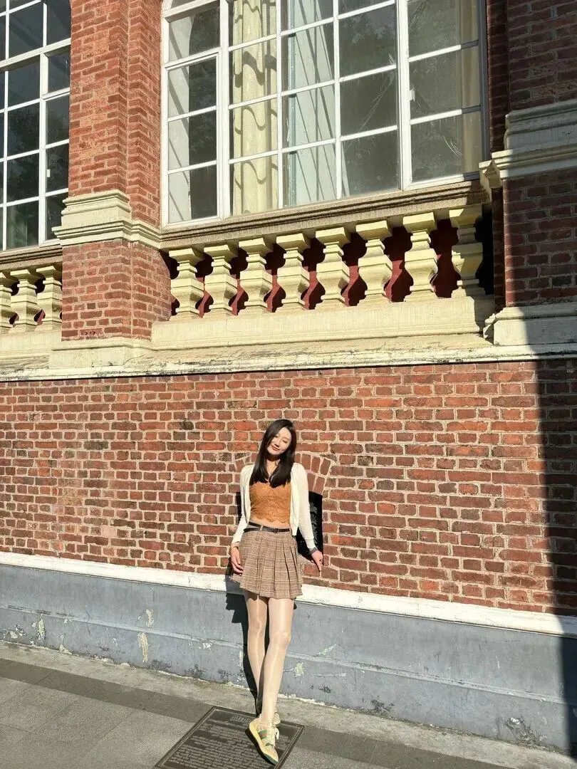 红砖建筑台子也被列为一种新的拍摄对象。她坐在那里,身上穿的是米白色开衫配上浅棕色吊带的搭配方式,裙子的颜色同建筑所使用的颜色相结合。从整体上来说温柔又复古,下午茶时着这样搭配,拍照一定出片。