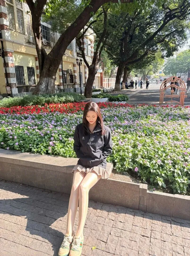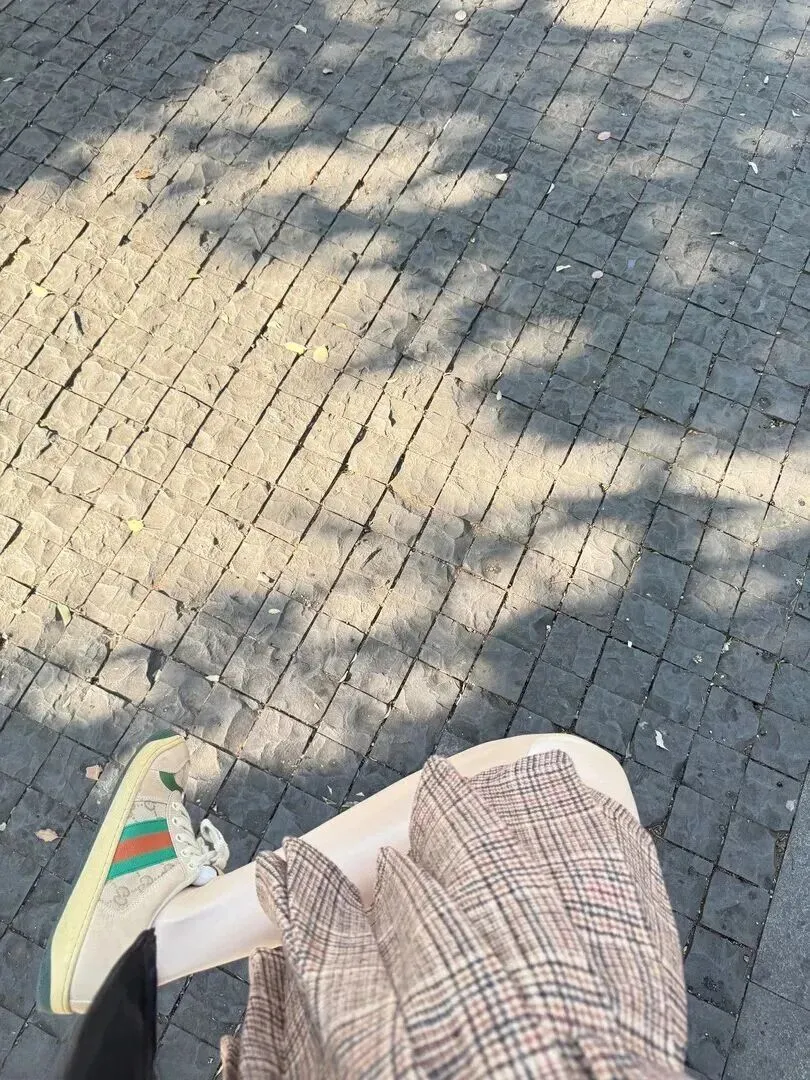 格纹裙真的百搭,细节也可看。近看裙子格纹为棕、灰、黑三色交织组成,精致又带有点复古的感觉。她穿了一双米白色复古板鞋,鞋面用红绿撞色的织带装饰,复古感十足。地上落着花瓣、叶子,春日的浪漫气息就一下子被点燃了。