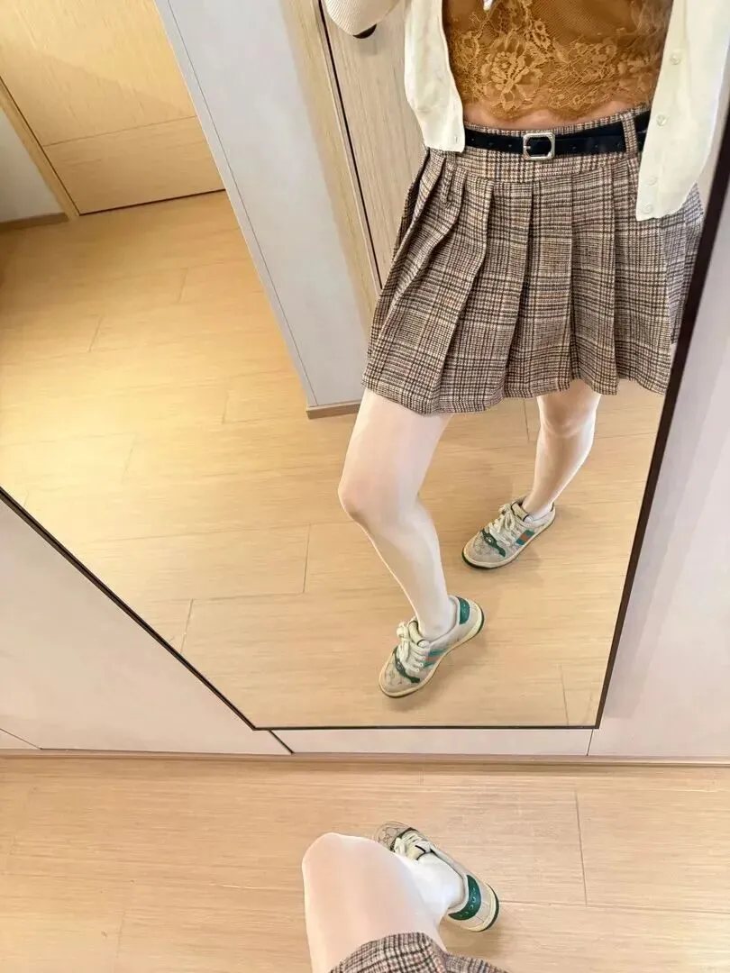 这套衣服在家穿也不会有违和感。镜子里的她穿着焦糖棕蕾丝吊带+米白开衫,下面搭配的是格纹裙,脚下穿的是做旧风的拼色运动鞋。松松垮垮却又有时尚感的居家放松感拿捏得很好。