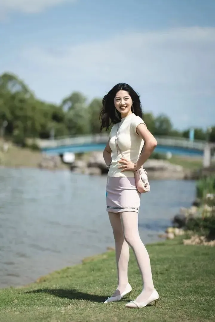 想要慵懒一些?这套很舒适,米黄色紧身针织短袖有坑条纹理显瘦且复古。穿浅粉色A字短裙和米白细跟尖头鞋,鞋上的蝴蝶结很俏皮。站在木质步道上,闭眼感受微风,深棕大波浪的飘动画面很安静、很美好,使人们立刻想去度假。