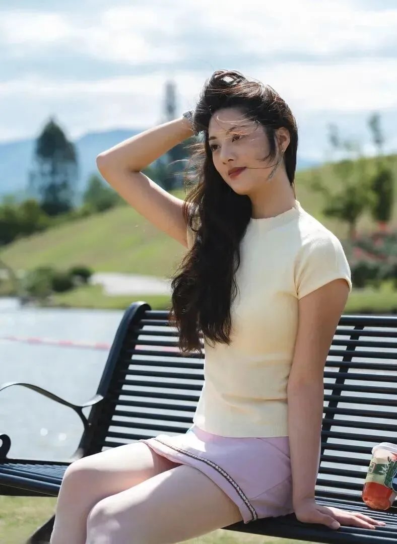 随性自然派的穿搭心得就是米黄色针织衫加浅粉色短裙为竖条纹,显身材好。坐在铁艺长椅上,头顶着银色的手表,很精致。用橙色饮料来作为点缀物,使得远处的山水有治疗、慵懒的感觉。