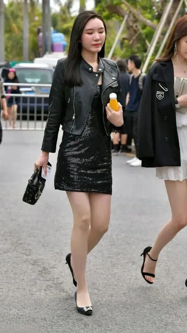 先看皮衣加亮片裙的组合。皮衣硬朗、亮片裙闪耀、两件穿出效果佳。短款皮夹克拉高腰线,亮片裙走在路上都会发光,走路带风。穿一双黑色高跟鞋、超酷甜的装扮很抢眼,在约会、聚会等情况下会很合适,是你的不同凡响之处。