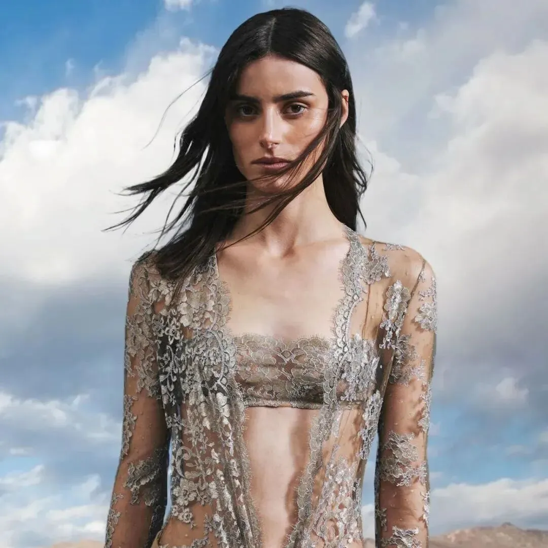女模穿蕾丝吊带裙,裙摆漂浮在身体上方 | Khaite 2026秋冬系列