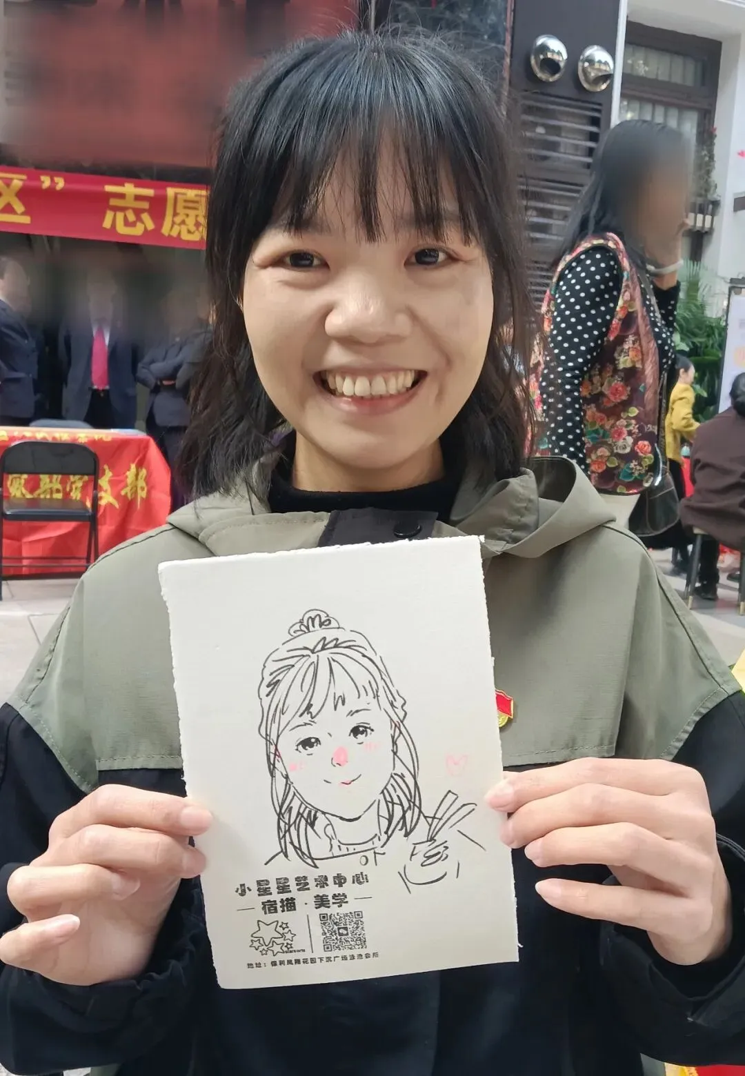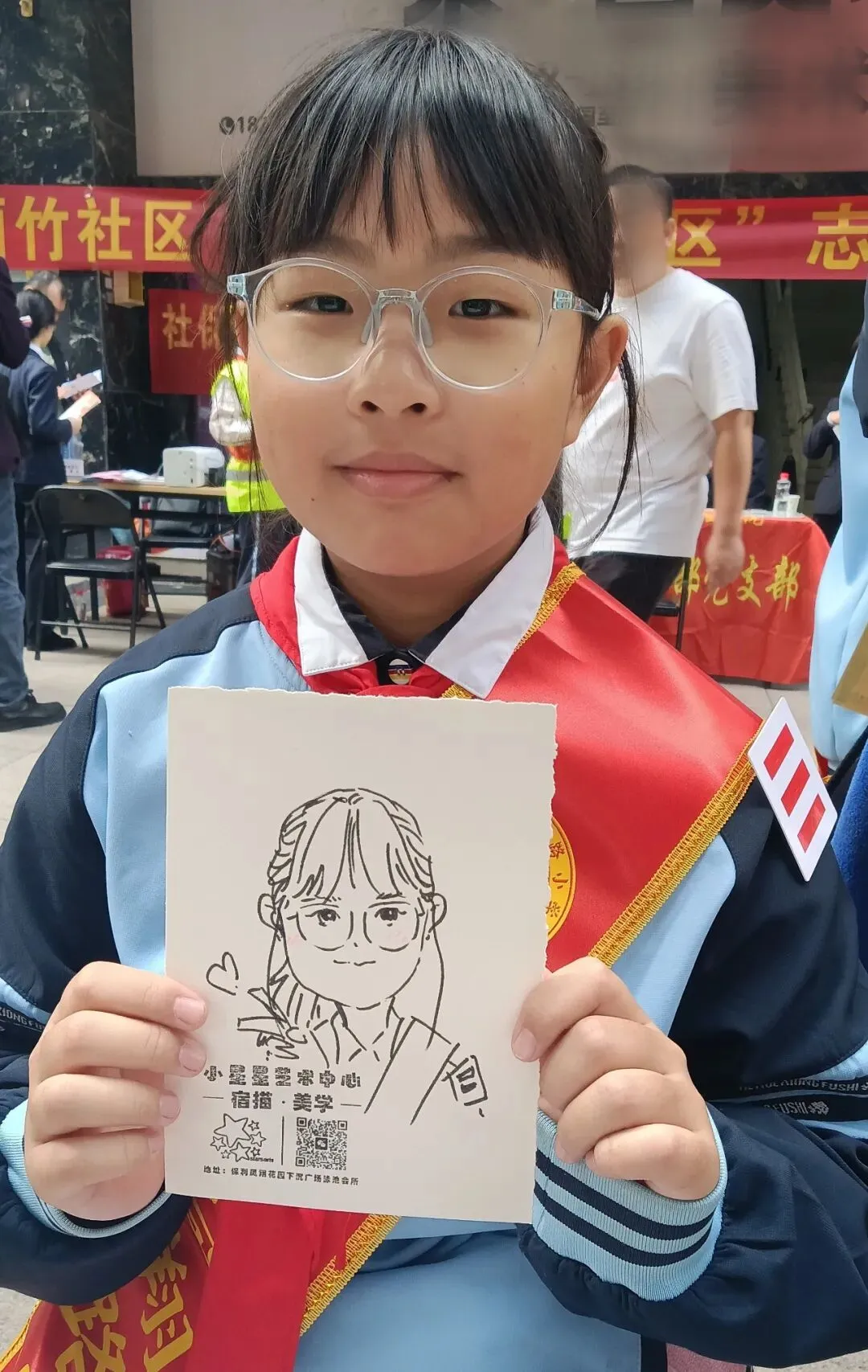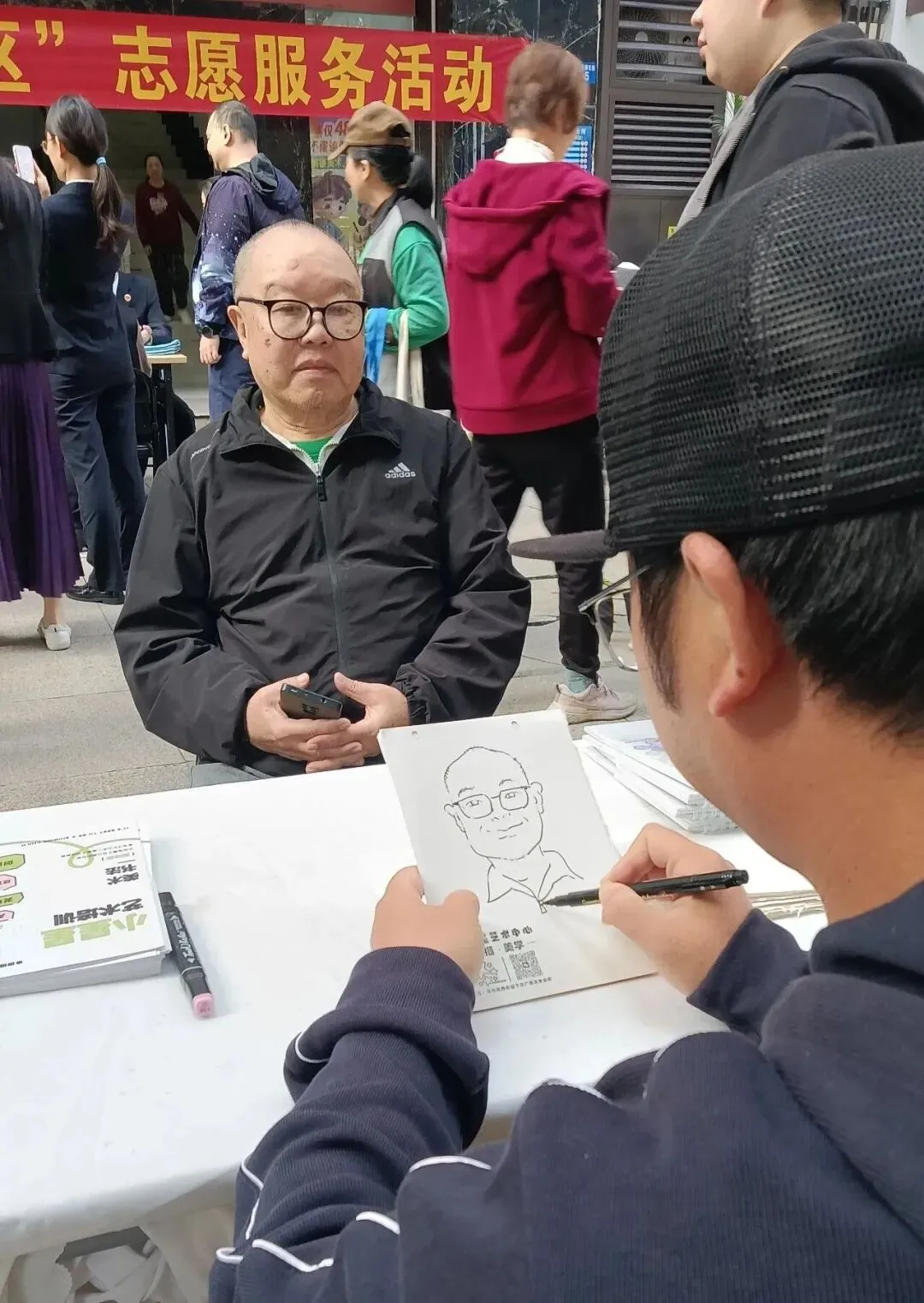 画室的老师们现场支起画具,以耐心与专业,免费为每一位前来的居民绘制专属头像。无论是天真烂漫的小朋友、忙碌的社区工作者,还是和蔼的长辈,都在笔尖的勾勒下,拥有了独一无二的艺术肖像。