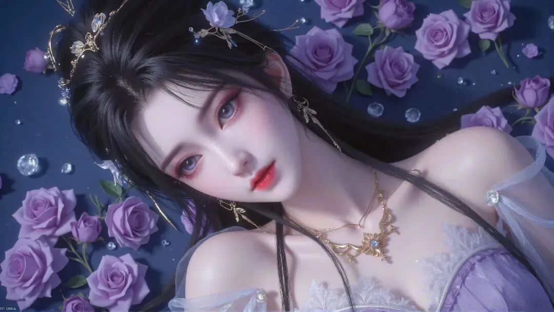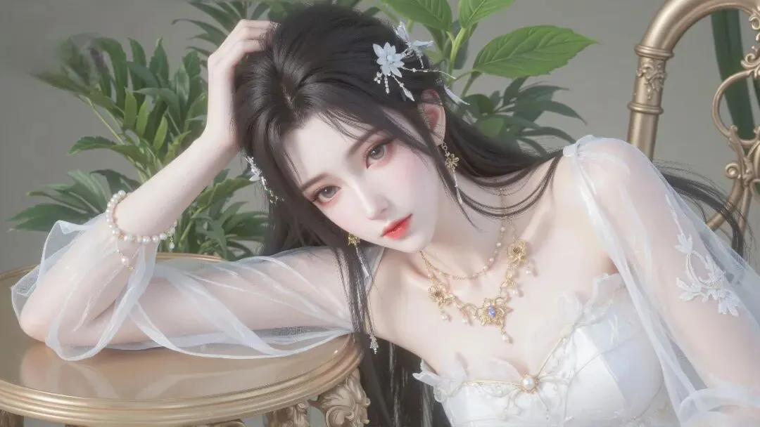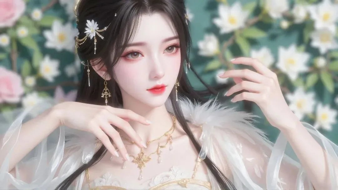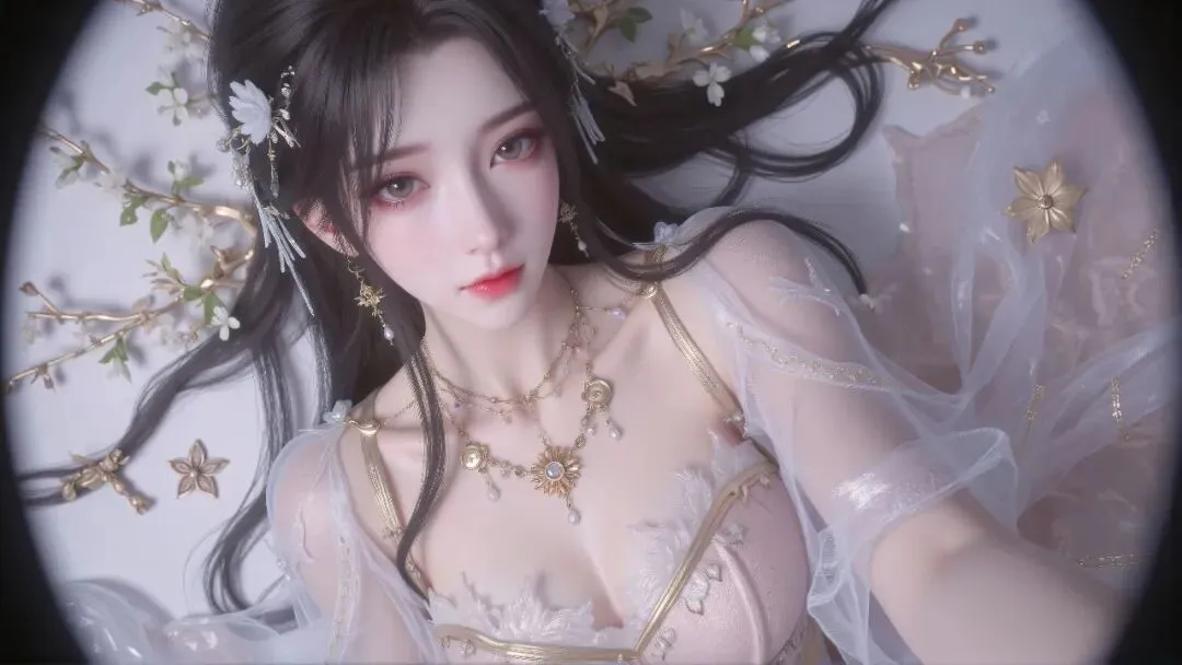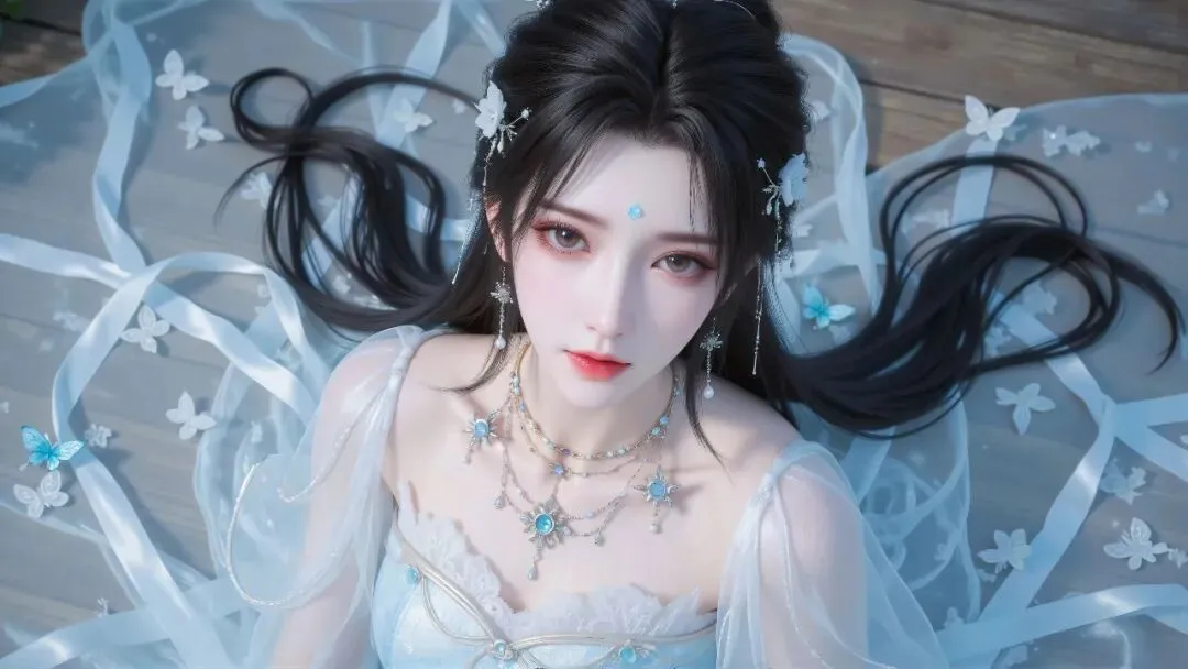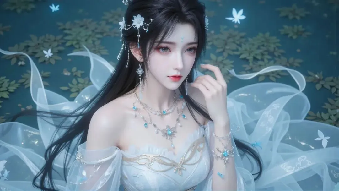 层叠的银链颈间轻垂,蓝宝坠饰与耳畔流苏相映成辉,腕间的精致银饰更添雅致。她抬眸望向前方,纤手微抬,衣袂与发丝在风中轻扬,周身萦绕着莹白的蝶与微光,宛如月下谪仙,清冷又温柔,尽显东方古韵的空灵与雅致。