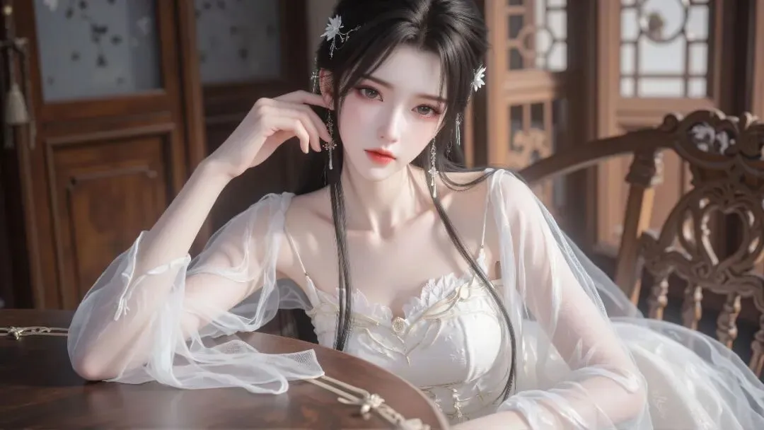 她抬眸望来,指尖轻触耳际,神情恬淡,在古雅木构与暖光的晕染下,尽显东方女子的温婉灵秀,宛如从旧时光里走出的仕女。