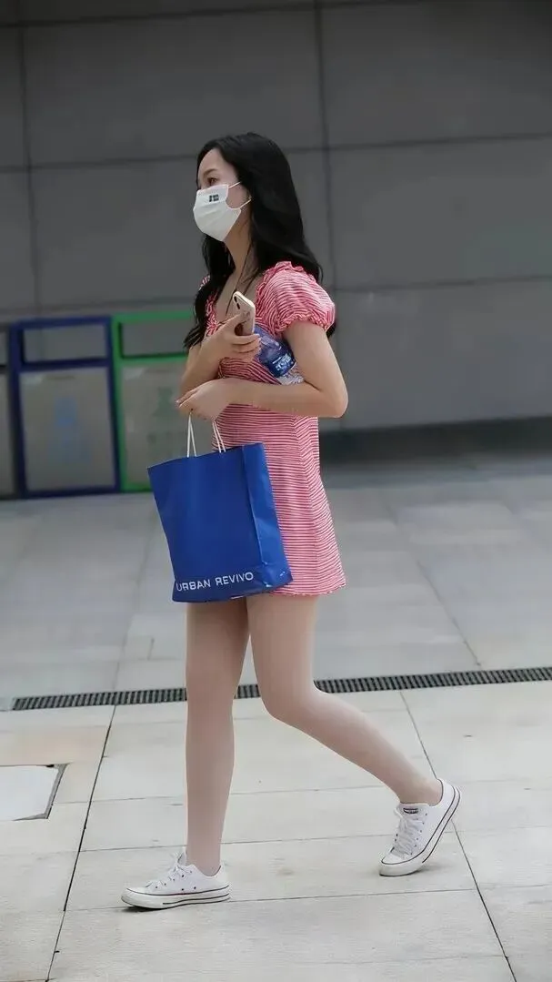 小姐姐戴上图案上面的白色口罩,风格也是一致。提着蓝蓝色的购物袋就出现了意外,亮蓝色和粉色碰撞出火花,整个造型一下就鲜活起来。