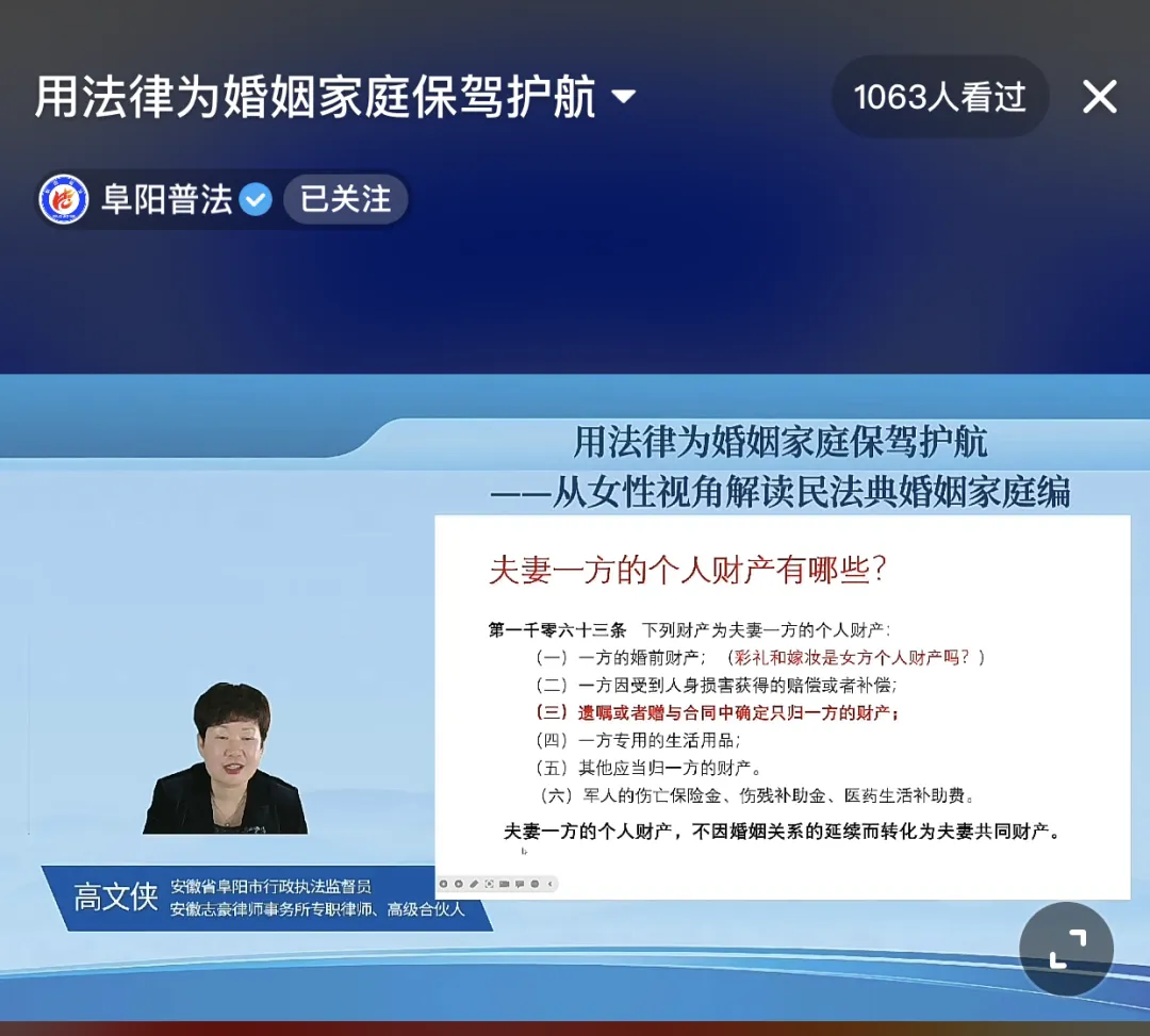 安徽志豪律师事务所高文侠主任从“彩礼、合法婚姻的成立、女性在婚姻家庭中的地位、个人财产和夫妻共同财产、个人债务和夫妻共同债务、离婚、继承”七个方面对民法典婚姻家庭编的相关内容进行了详细讲解,直播共吸引1252名网友在线观看,抖友们纷纷点赞!