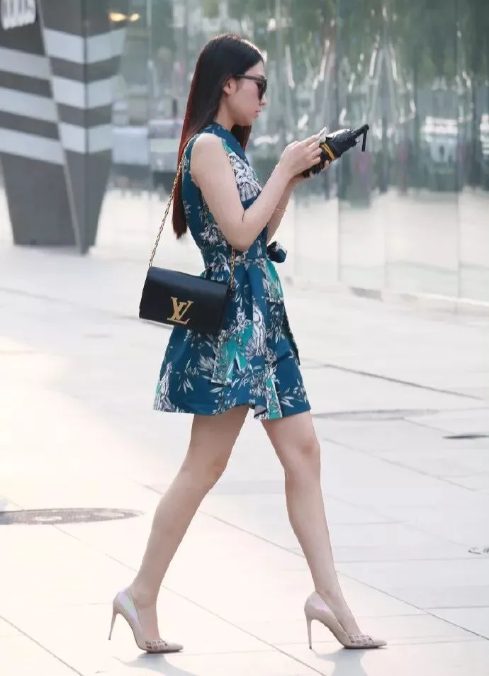 天的颜色是可以小清新,也可以很靓丽的,小姐姐身上穿着这件绿色的连衣裙,吊带的款式,小小的v领,让她看上去更加的有韵味,裙身上面布满春花,色彩艳丽,脚上搭配着一双尖头的高跟鞋,走起路来显得十分的成熟哦。