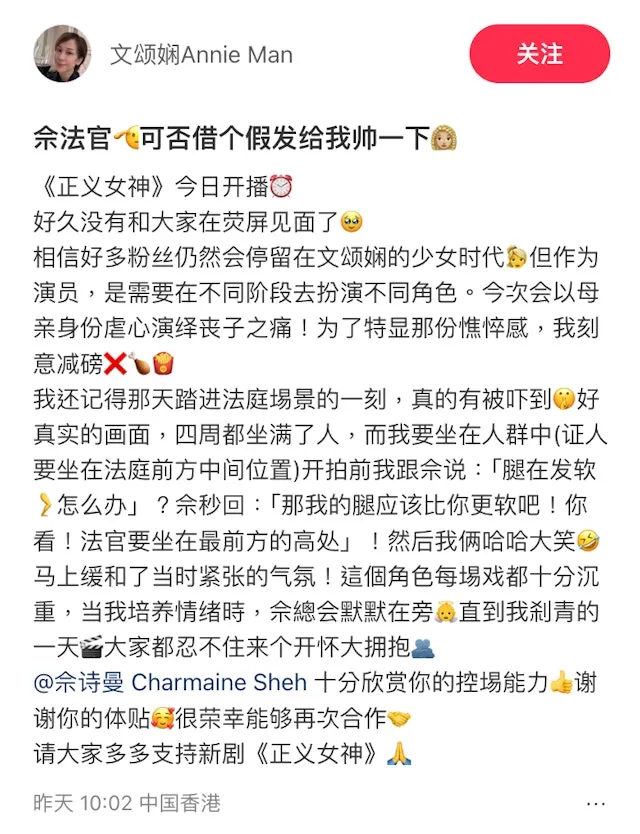 另外,文颂娴分享一入法庭场景被吓到脚软,更同阿佘讲吓到脚软,阿佘秒回:「那我的腿应该比你更软吧!你看!法官要坐在最前方的高处」,令文颂娴放松下来。