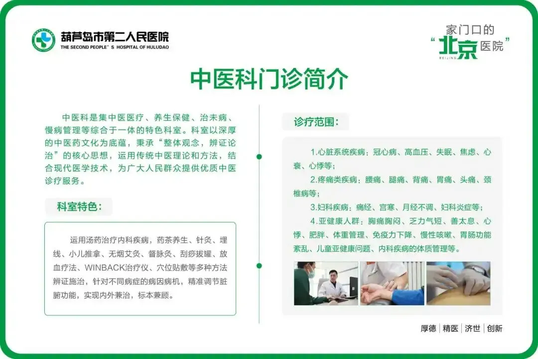 葫芦岛市第二人民医院中医科集中医预防、治疗、康复、保健于一体,以深厚的中医药文化为底蕴,秉承“整体观念,辨证论治”的核心思想,运用传统中医理论和方法,结合现代医学技术,为患者提供优质中医诊疗服务。
