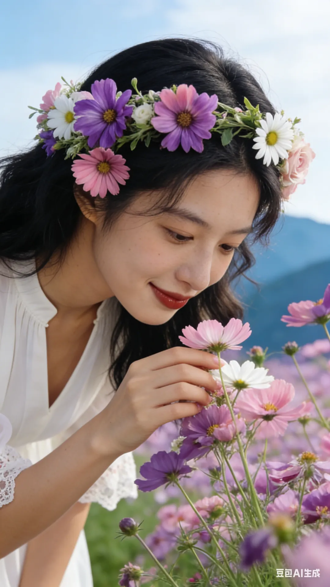 “指尖轻触格桑花,低头嗅花”:少女微微俯身,伸出指尖轻轻触碰格桑花,头微微低下,轻嗅花朵,表情沉醉,沉浸在花海的芬芳之中。