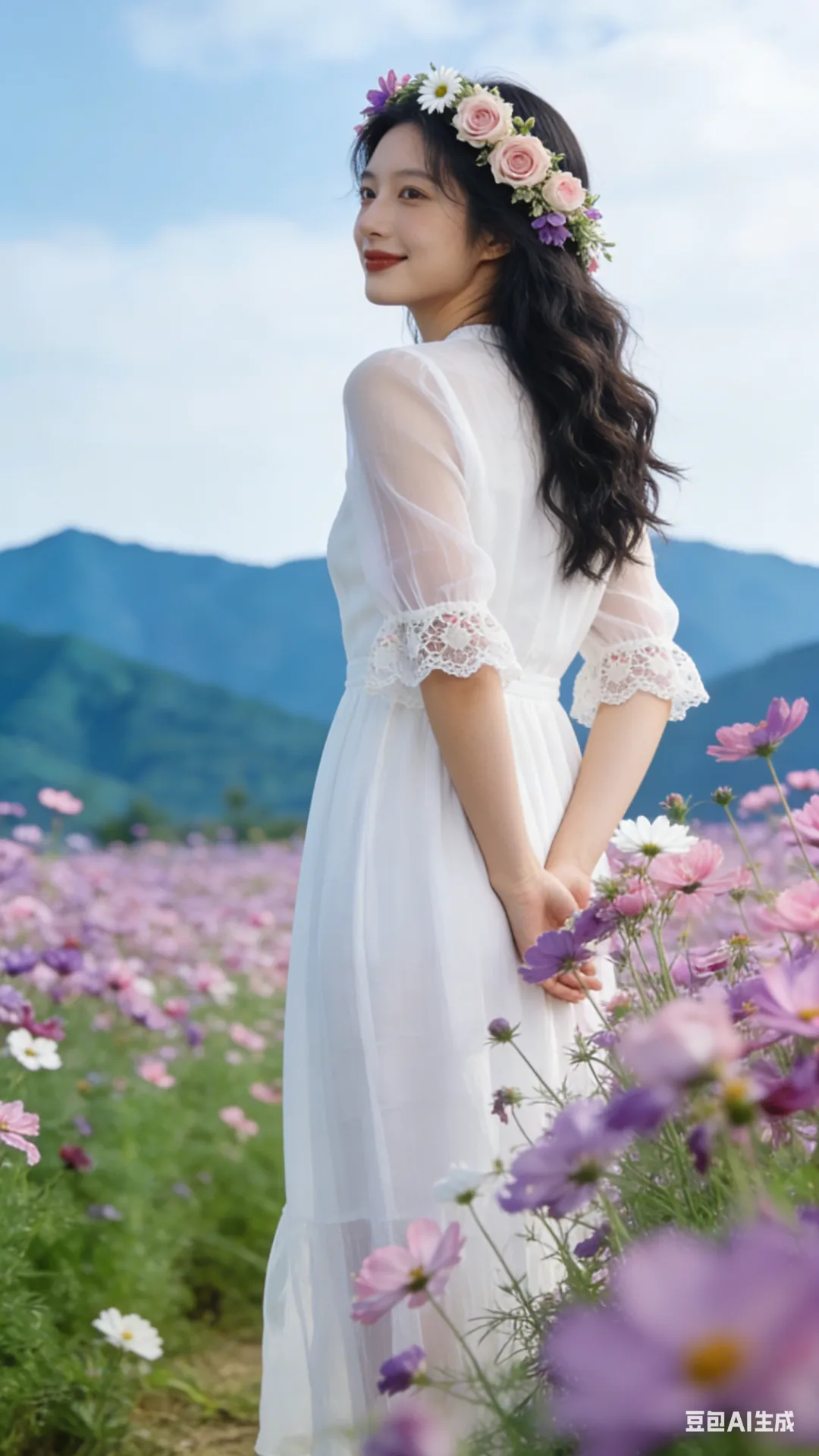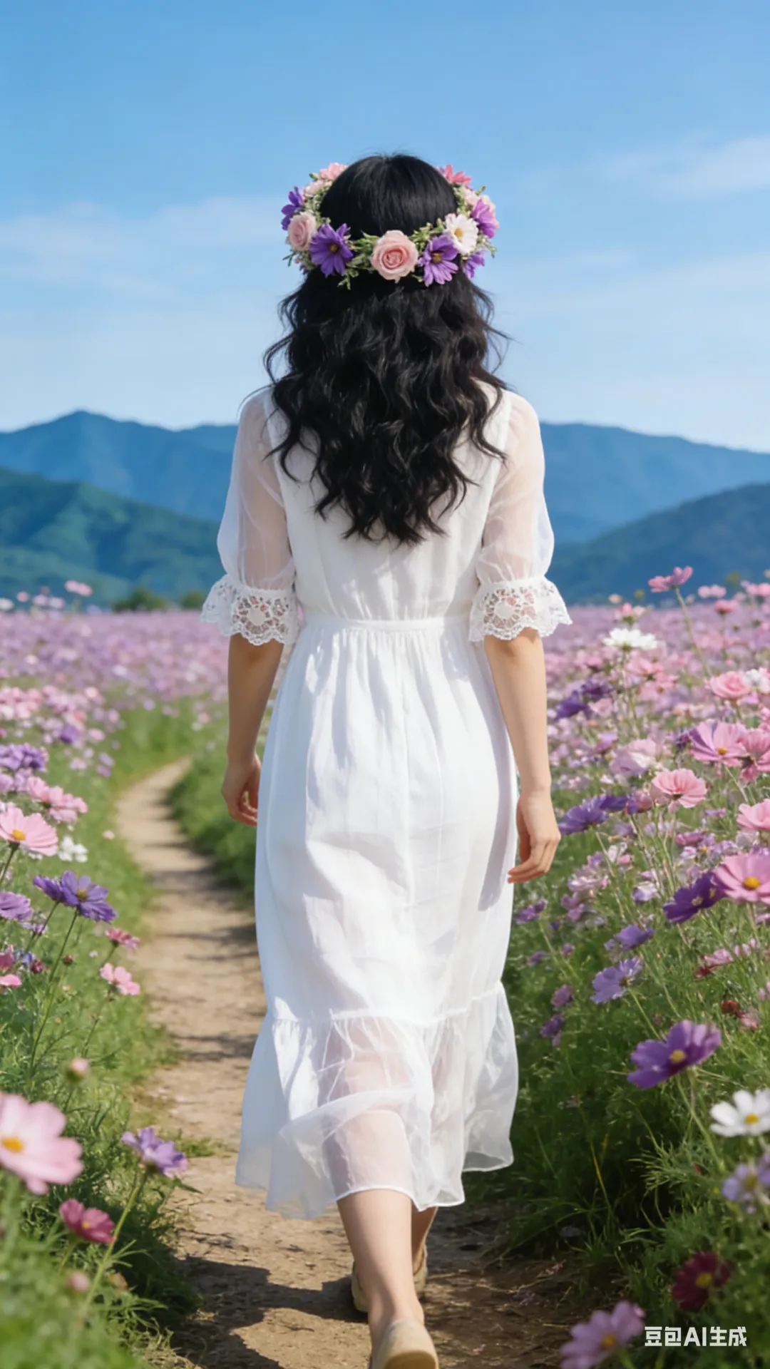“漫步花田小径,背影朝向镜头”:少女沿着花田小径缓缓漫步,背影朝向镜头,长发与裙摆随风摆动,营造出一种悠然的氛围。