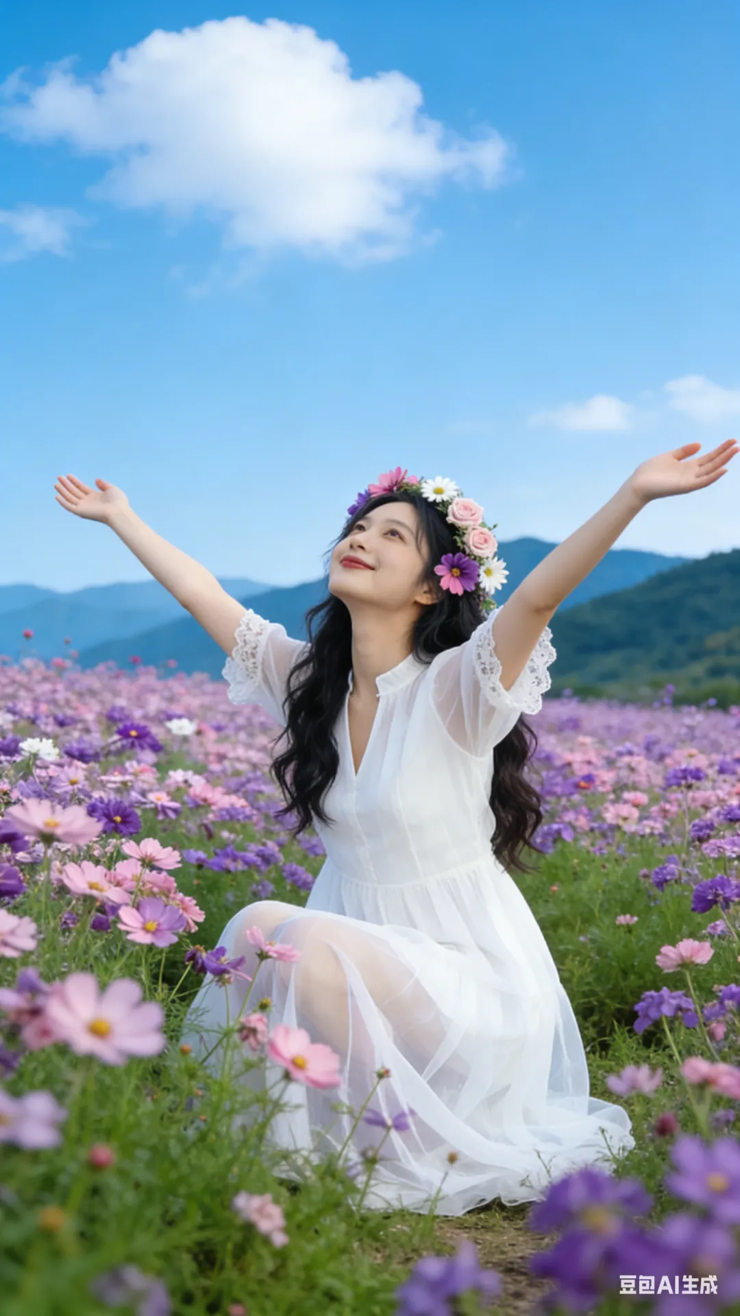 “双臂张开,抬头望天空”:少女站在花海中,双臂张开,抬头仰望天空,发丝随风飘动,展现出自由与惬意。