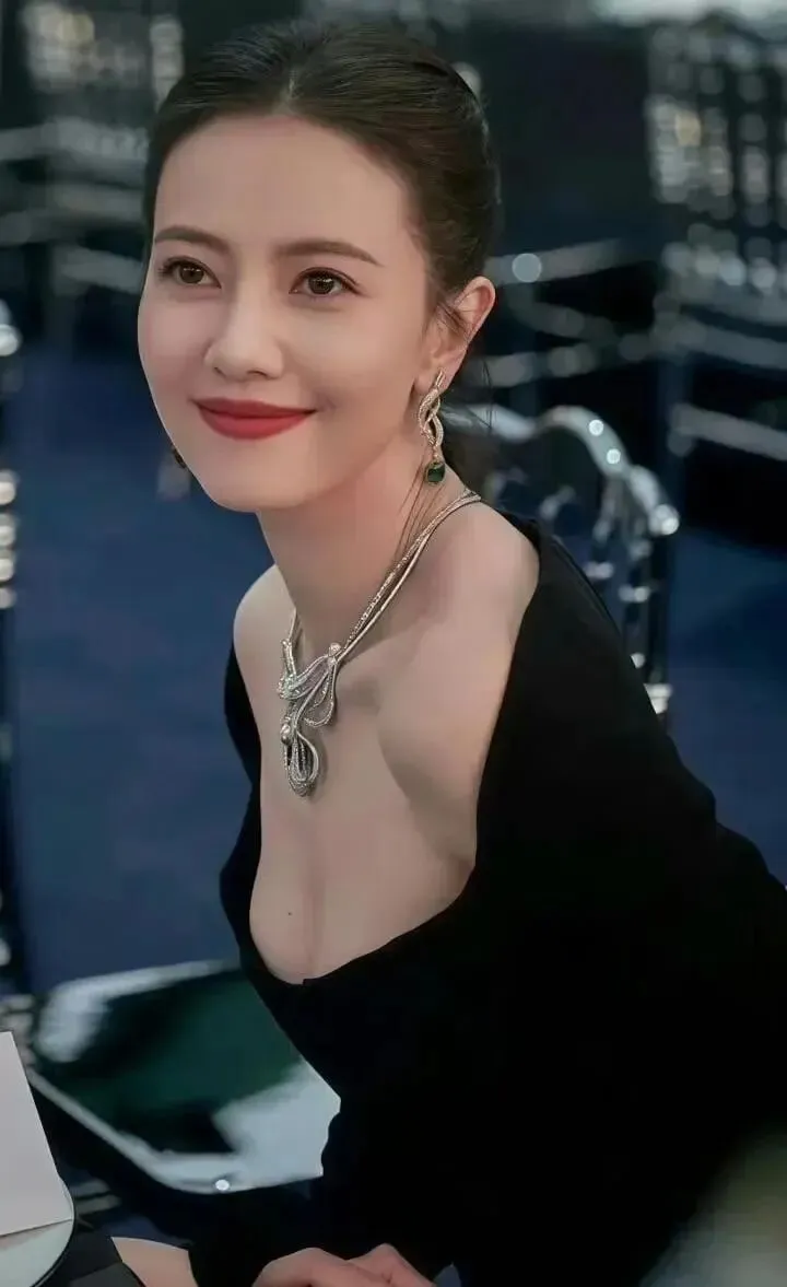 高圆圆穿着一袭黑色抹胸衣裙,脖子戴着金色绳索首饰,她俏脸喜笑颜开,侧身露出自己的事业线,绝对性感迷人!