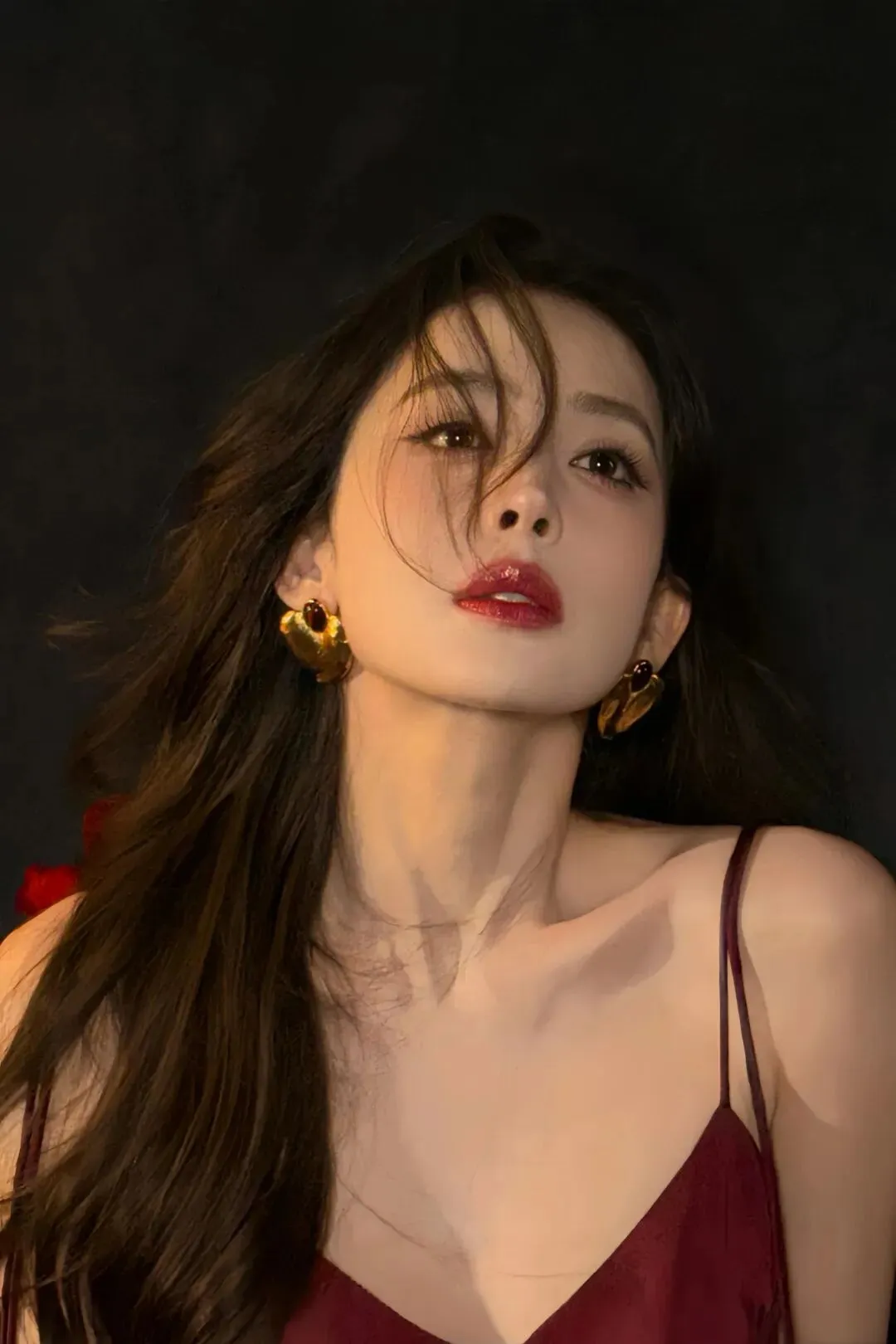 墨色如宣纸般铺展,她缓步走入画中——一身绛红绸裙,是暗夜里唯一醒着的火。长发被风梳成流云的形状,碎发拂过脸颊,像春日的柳丝轻触湖面。玫瑰在她指尖、膝上、脚边静静开放,仿佛时间在此处停驻,只余香气在光影中流转。