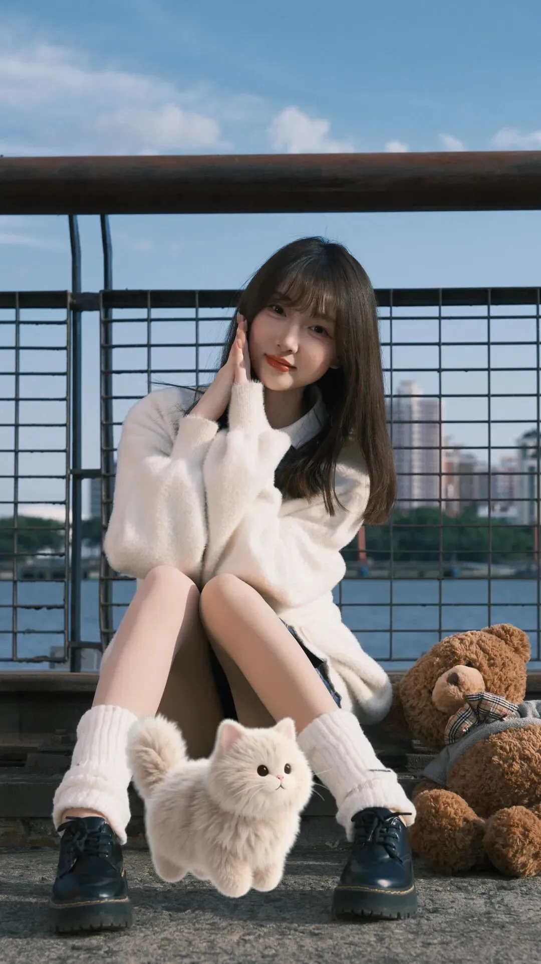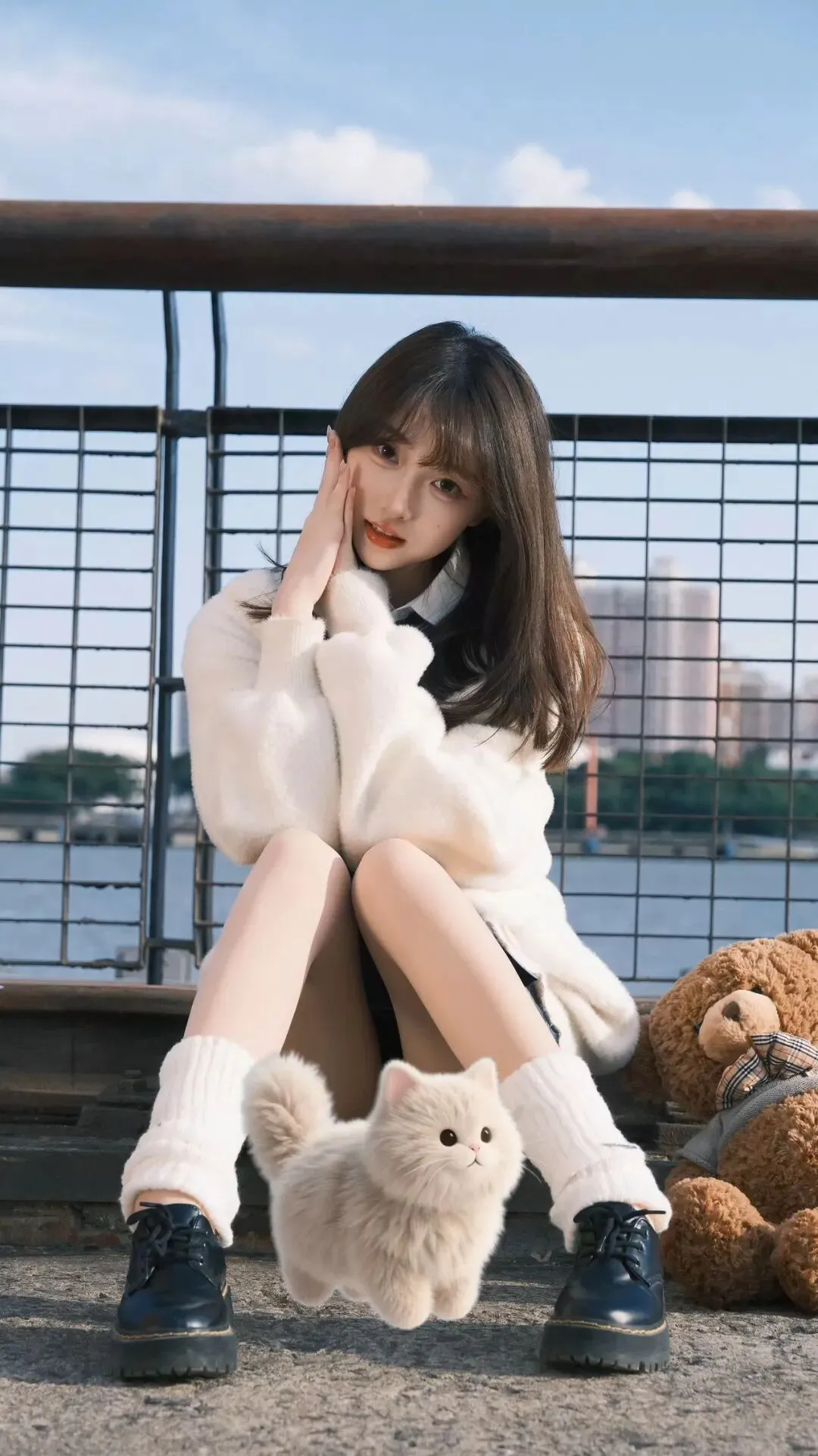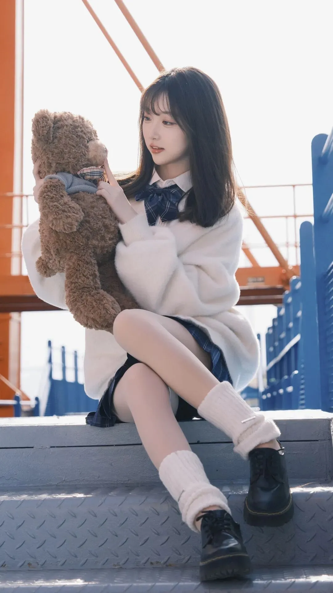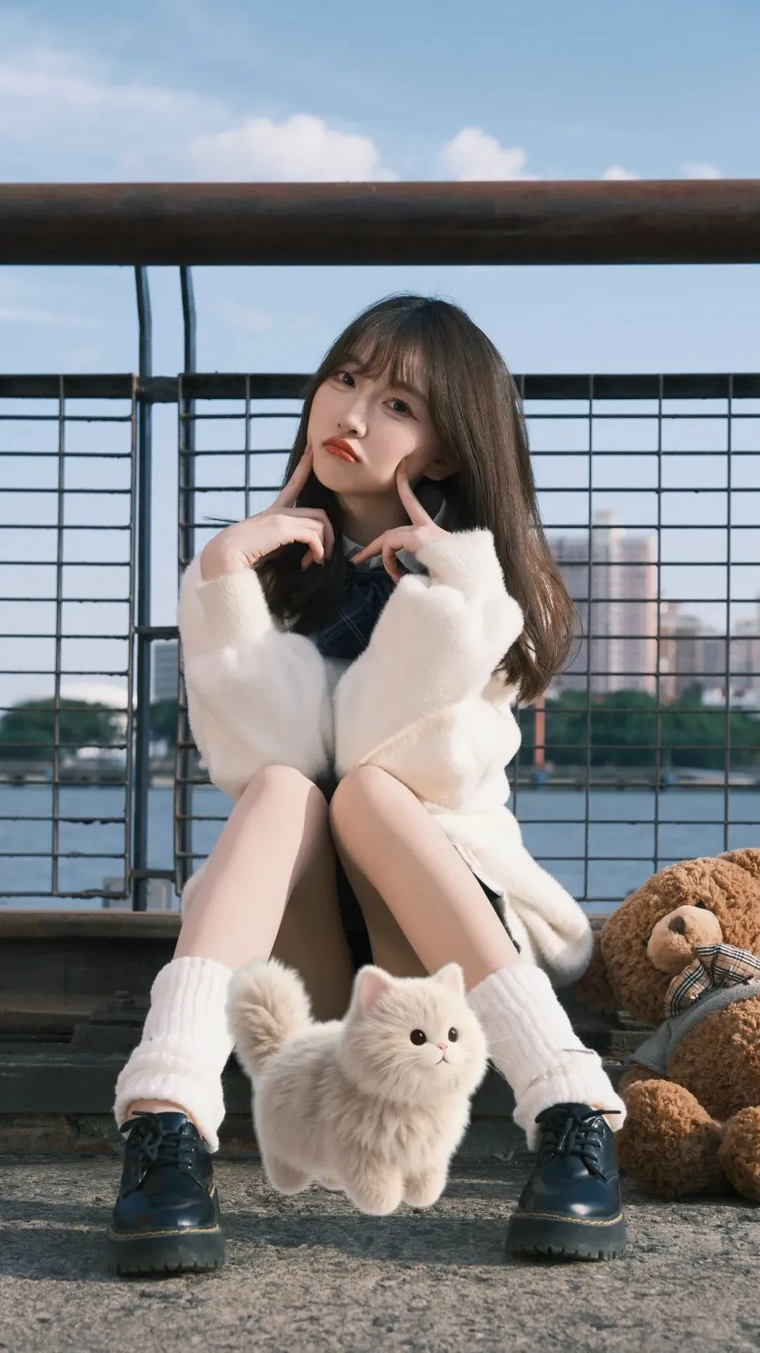 这些姿势围绕白色毛绒外套的甜美元气设计,借助小熊玩偶增加互动感,结合海滨护栏、台阶等多元场景,无需刻意摆拍,新手跟着做就能拍出自然好看的海滨写真照片。