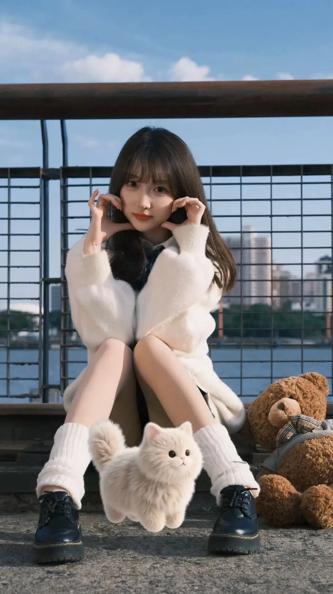 单手轻比心型手势,侧身蹲在护栏前,身体微微侧转,背景是海面与城市,显松弛又有格调,像不经意被抓拍。