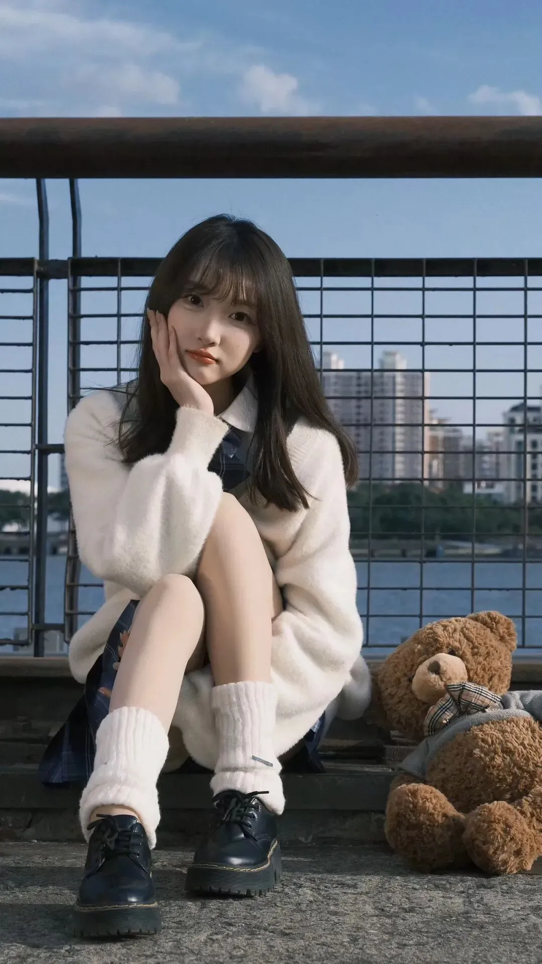 单手轻撩头发,侧身蹲在护栏前,身体微微侧转,背景是海面与城市,温柔又有故事感,显耐看又有个性。