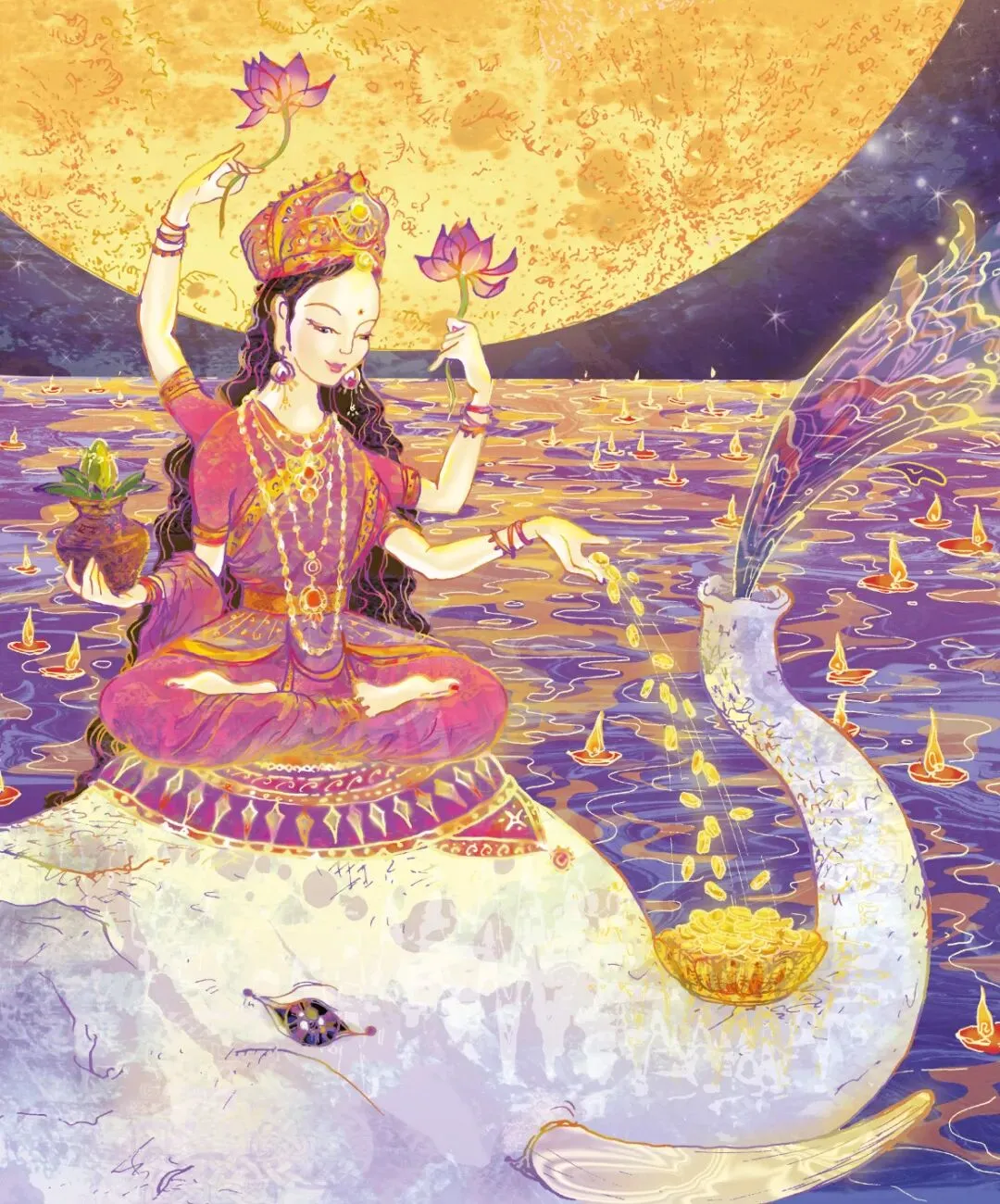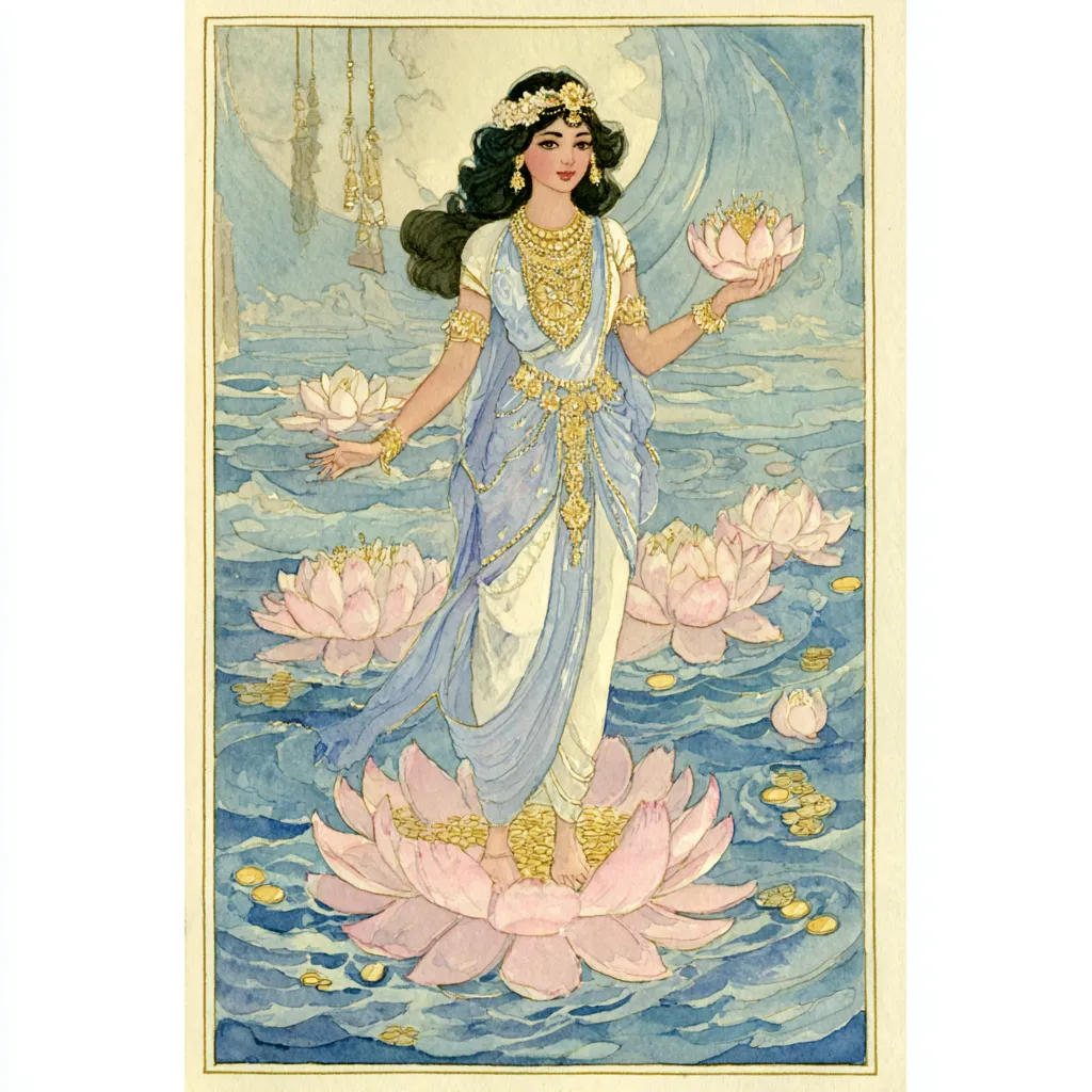 拉克希米女神诞生于「乳海」,是世间美丽与丰盛的化身。她拥有令众生艳羡的爱情与婚姻,周身散发温柔光芒,双手能涌现无限珍宝。在印度诸神与阿修罗合作搅动乳海时,她以光华圣女之姿现身,与守护之神毗湿奴一见钟情。随后,在毗湿奴多次转世拯救世界的过程中,女神也跟随转世为其分忧解劳。因此,她不仅是财富之神,也被视为家庭与婚姻的守护女神。