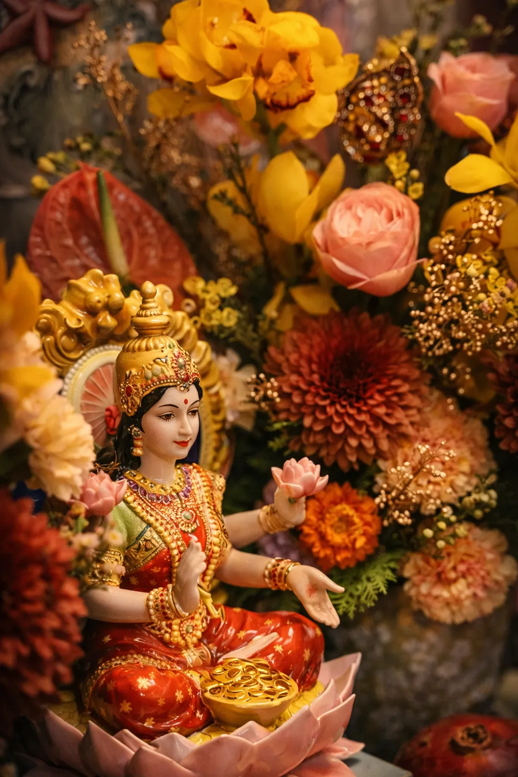 在拉克希米女神的形象中,四只手臂代表人生四大目标:道德(Dharma)、财富(Artha)、爱(Kama)及自觉(Moksha手持莲花的她,象征引领众生从业力中解脱,无论出身高低,皆能获得生命最美好的丰盛。