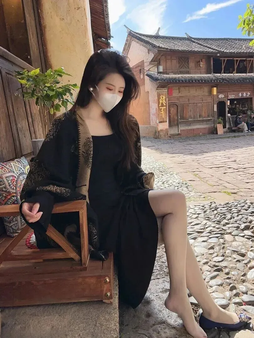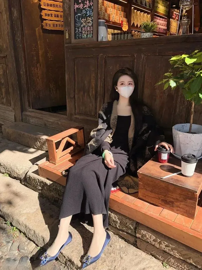 第二套属于懒人必备的吊带长裙,黑色竖条纹针织裙可以很好地遮掩身形中的瑕疵之处,显瘦效果满分。外面裹上一件同样的针织开衫,开衫上的抽象纹路时隐时现,宽松的版型使身体更随意更自由。脚上的依然是那双藏蓝色的平底鞋,只是鞋扣是方形水钻,和上次的亮化风格不谋而合。这样的穿着非常适合到古镇来游玩,一天穿不了一只鞋都不会感到疲累,而且十分的引人注目。