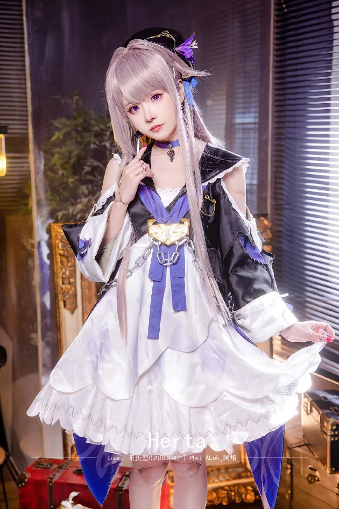 阳炎型HMSGLUE的黑塔cosplay堪称"艺术品级别",浅紫色长发搭配黑色镶紫帽饰,完美还原了角色"天才少女"的冷艳气质。最惊艳的是她对复古场景的驾驭能力,木质箱体与百叶窗的光影交织,营造出黑塔空间站特有的神秘氛围。