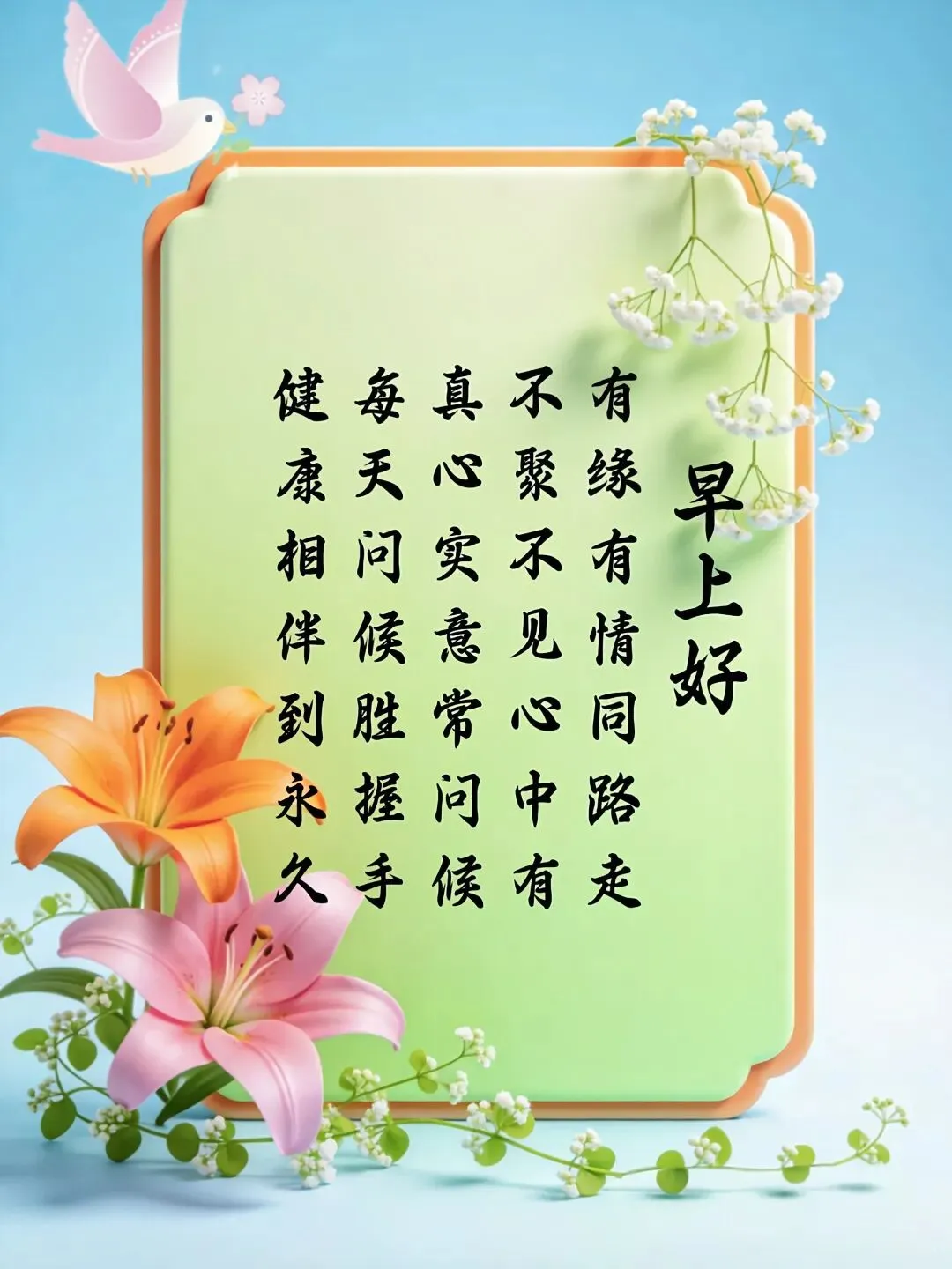 📅💌🙏亲切问候每日到,美好祝福天天传,健康相伴岁岁好,快乐心态时时欢。❤️✨真情厚重,惦念长存,愿你平安,喜乐常伴。早上好!🌞✨💕