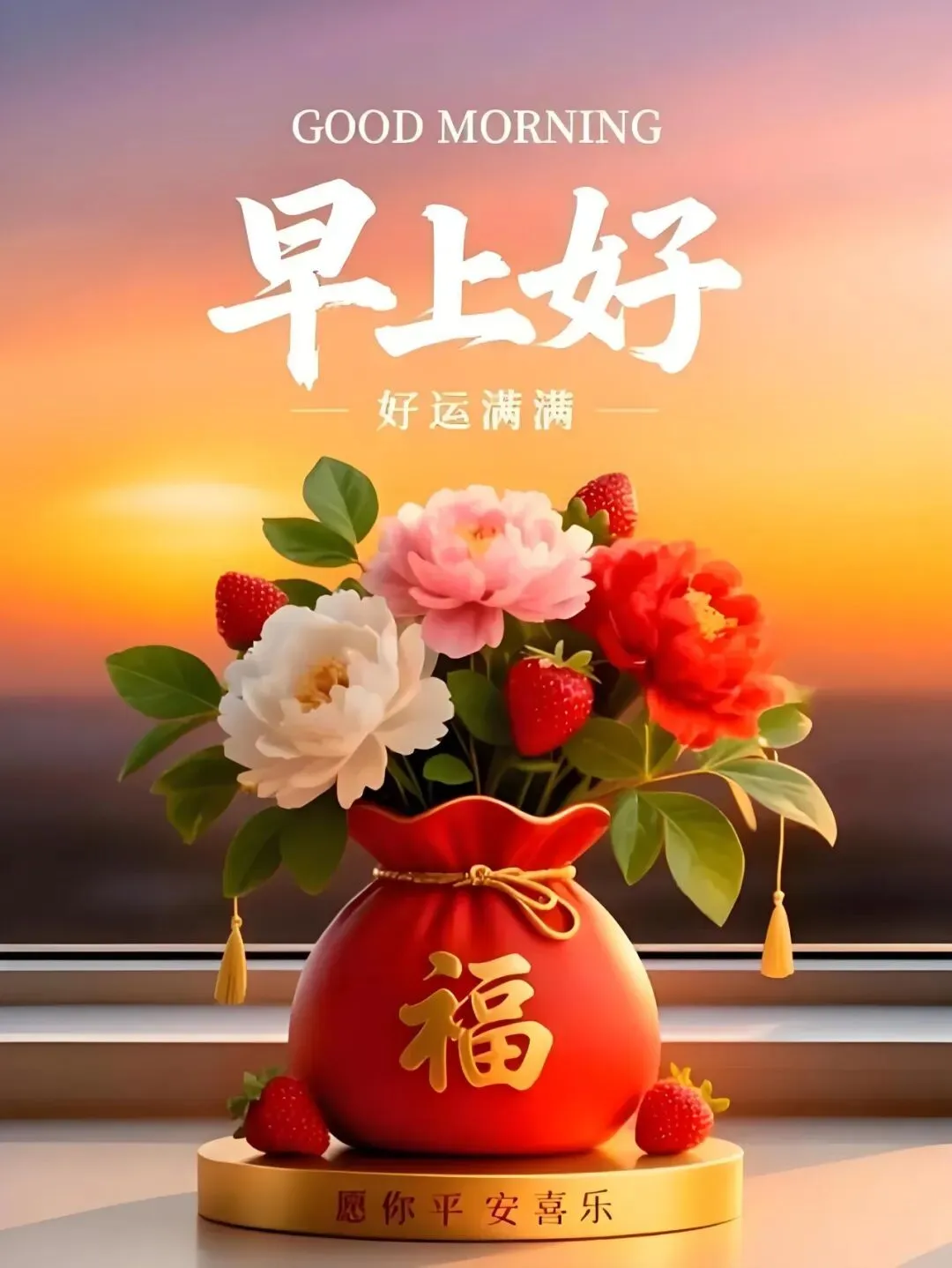 10. 一句早安,情意满满; 一份牵挂,温暖相伴; 一生安康,幸福长久; 一世平安,好运常伴。 祝亲友们:平安喜乐,健康顺遂,早安!