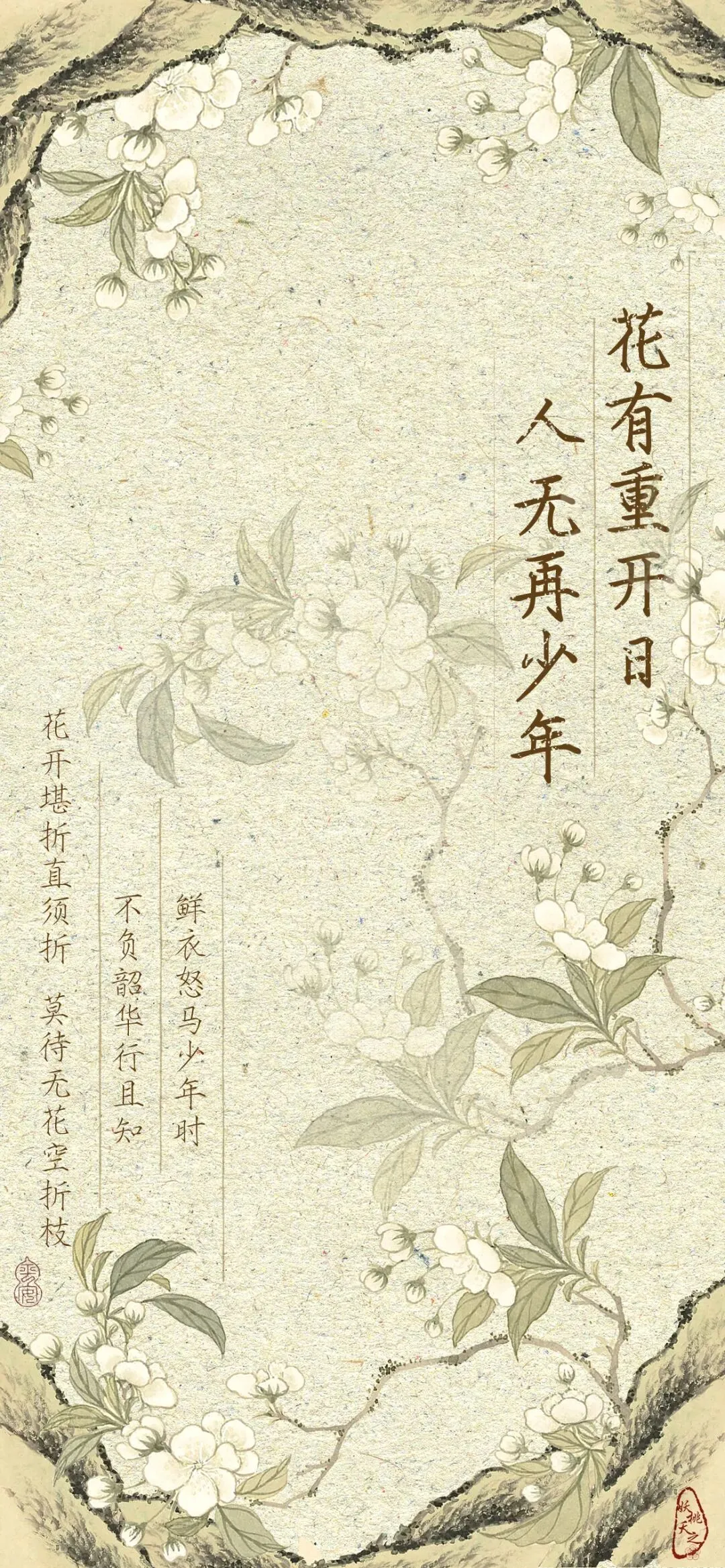 花枝环绕,留白处恰如人生的余裕,提醒我们:不必追悔过往,不必焦虑未来,只需在当下的花期里,尽情绽放。当你点亮屏幕,这满枝繁花便如青春的提醒——花会再开,而你的少年时光,唯有一次,值得全力以赴。