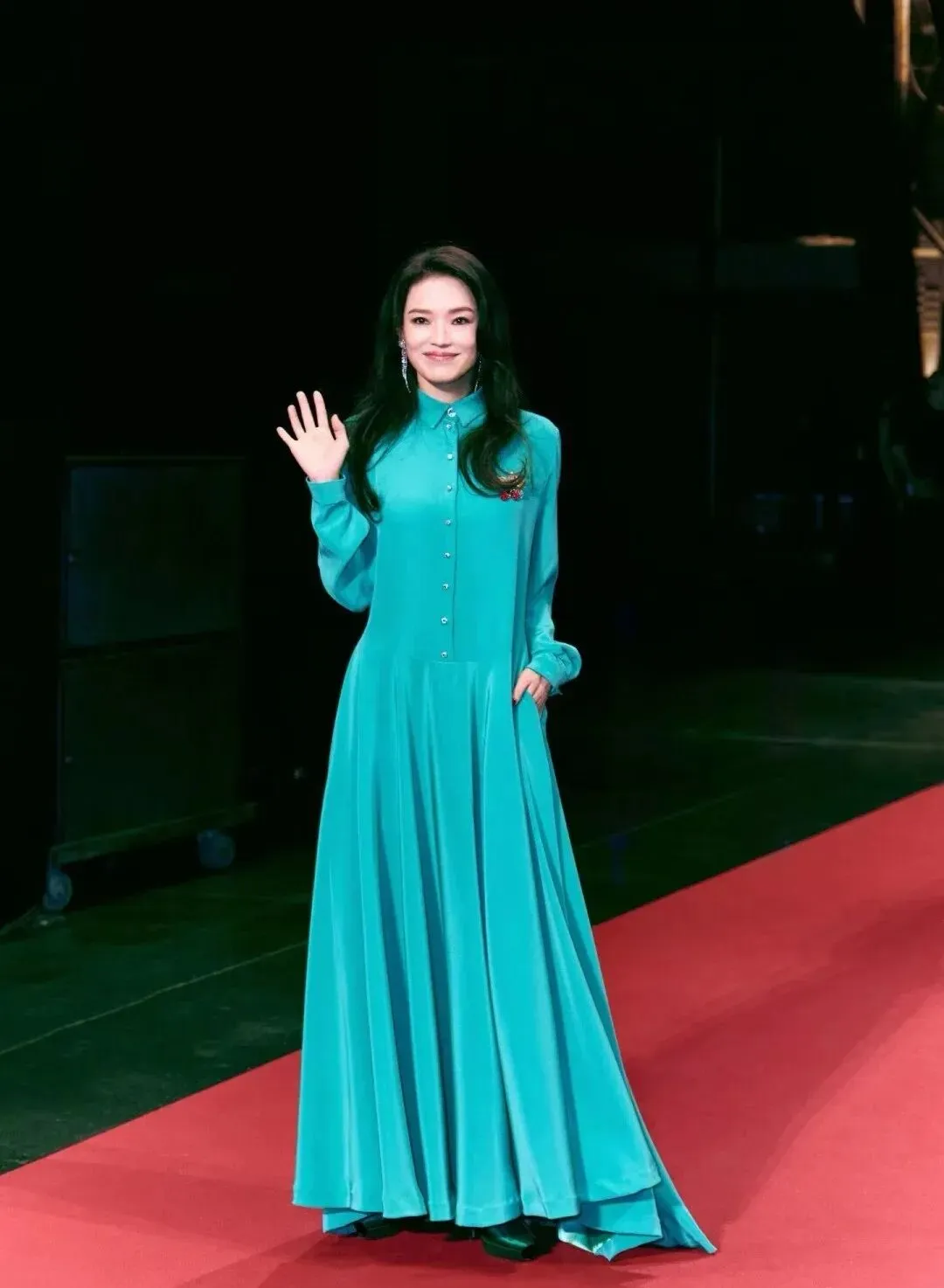 湖蓝色一般会给人感觉比较淡,而常见的黑白灰等安全色就显得很稳重。但是舒淇却选择了不选基础款的大波浪长发,并且带有空气感的效果,这样气质柔和了之后对于普通人来说头发披得太多容易压肩甚至显头大。