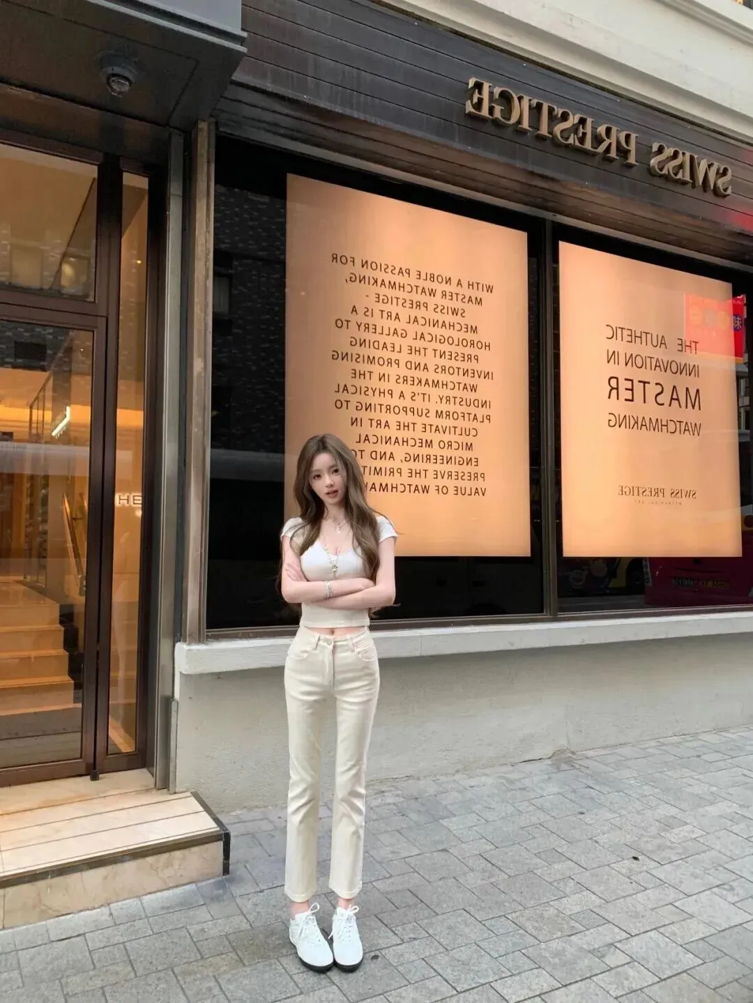 米白针织T恤、牛仔裤交叉抱胸站立,这次是在店里门口的橱窗前面,亮堂的灯光射出来。从橱窗到转身再到街头最后又回到店前这几张照片就像讲故事一样。她的全身全部是白色的,不同单品、不同配饰、不同姿态、不同场景都会呈现出不同的味道。这才是穿得高级的地方,不是堆了很多元素,而是每一件都放得恰到好处。