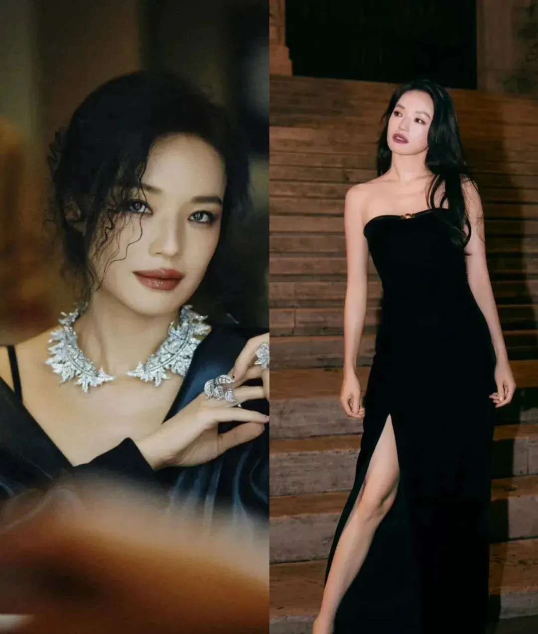 再举一个翻车的例子——很多人认为深色显瘦,于是盲目地买黑色或者藏蓝色的大裙摆,结果面料有点闪亮,在灯光下甚至更加显得壮硕。舒淇这条胜在雾面材质上带点哑光纱绸的感觉,并不夸张反光,在镜头前很立体但是没有膨胀感。现实当中越平滑、越细腻的材料就越能抵挡住因为表面粗糙而造成的反光造成的影响。